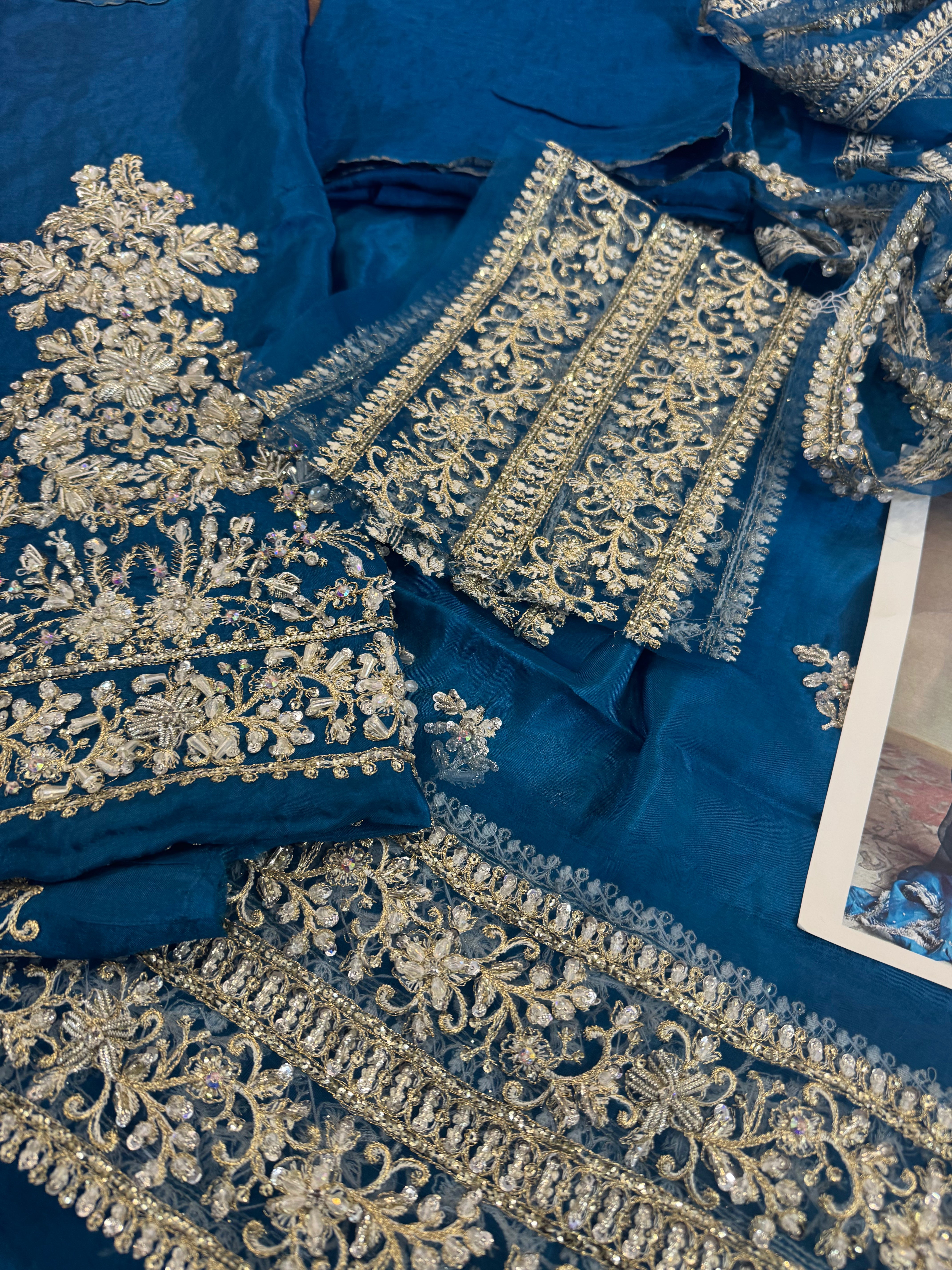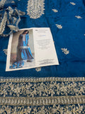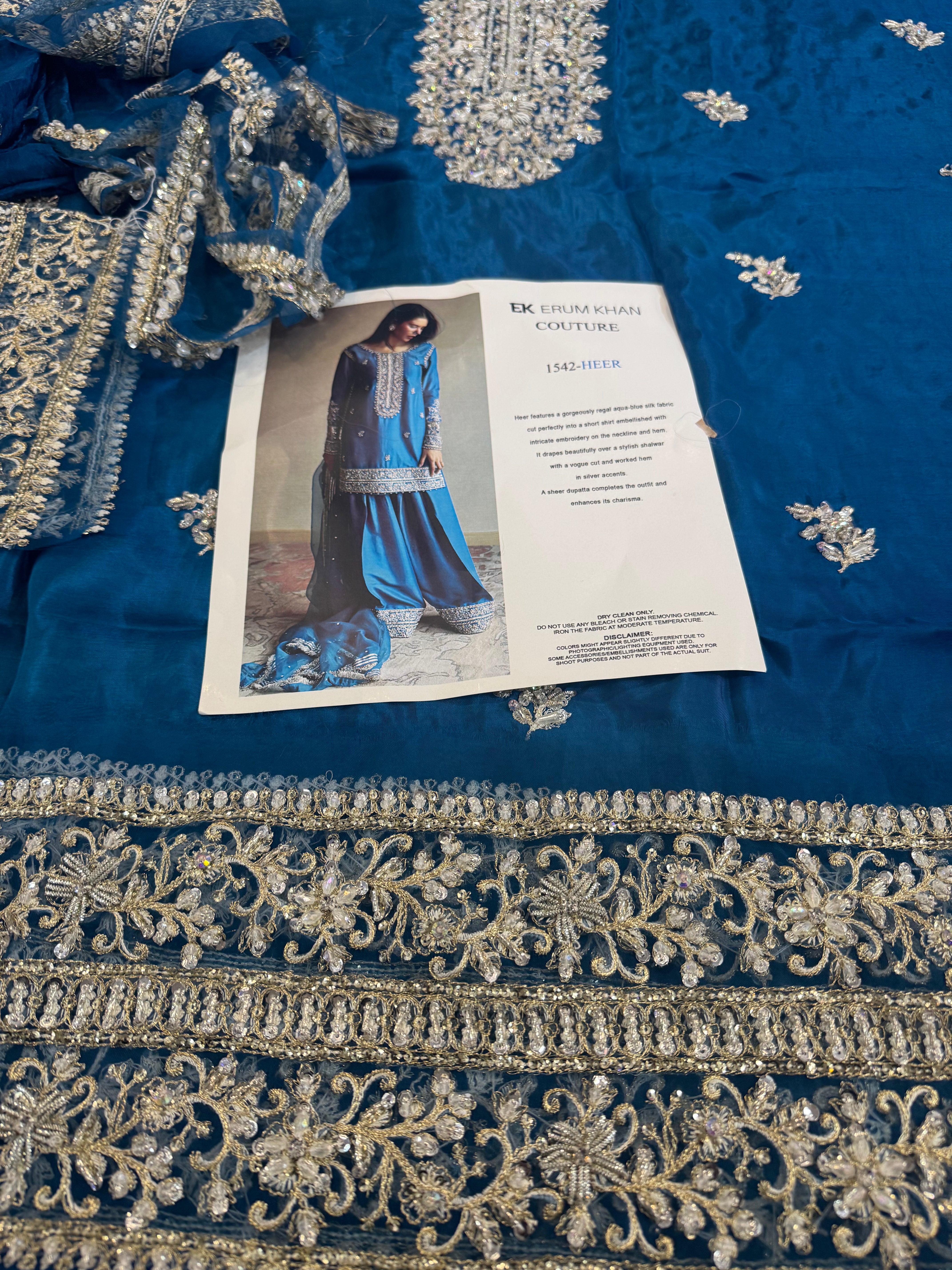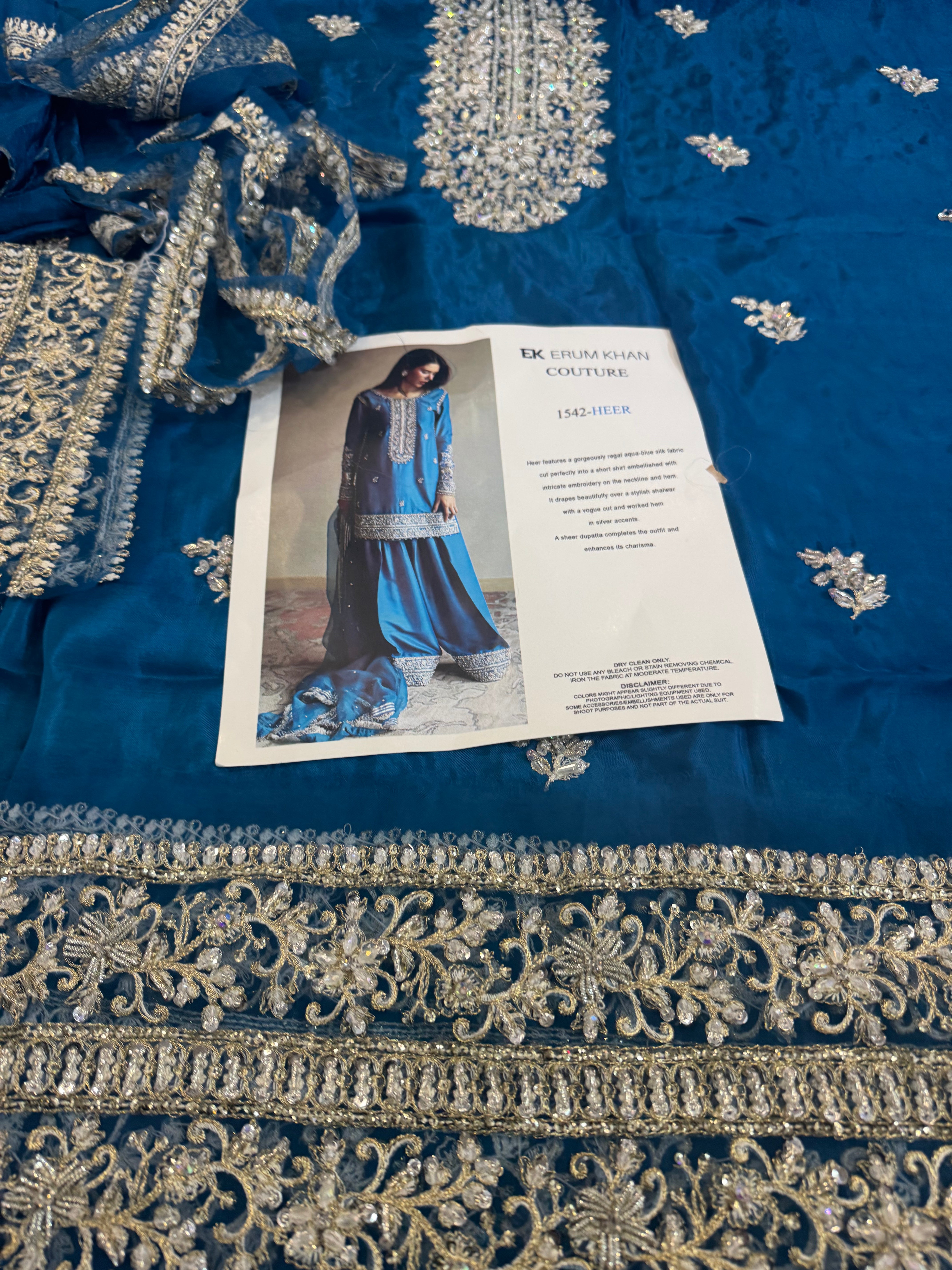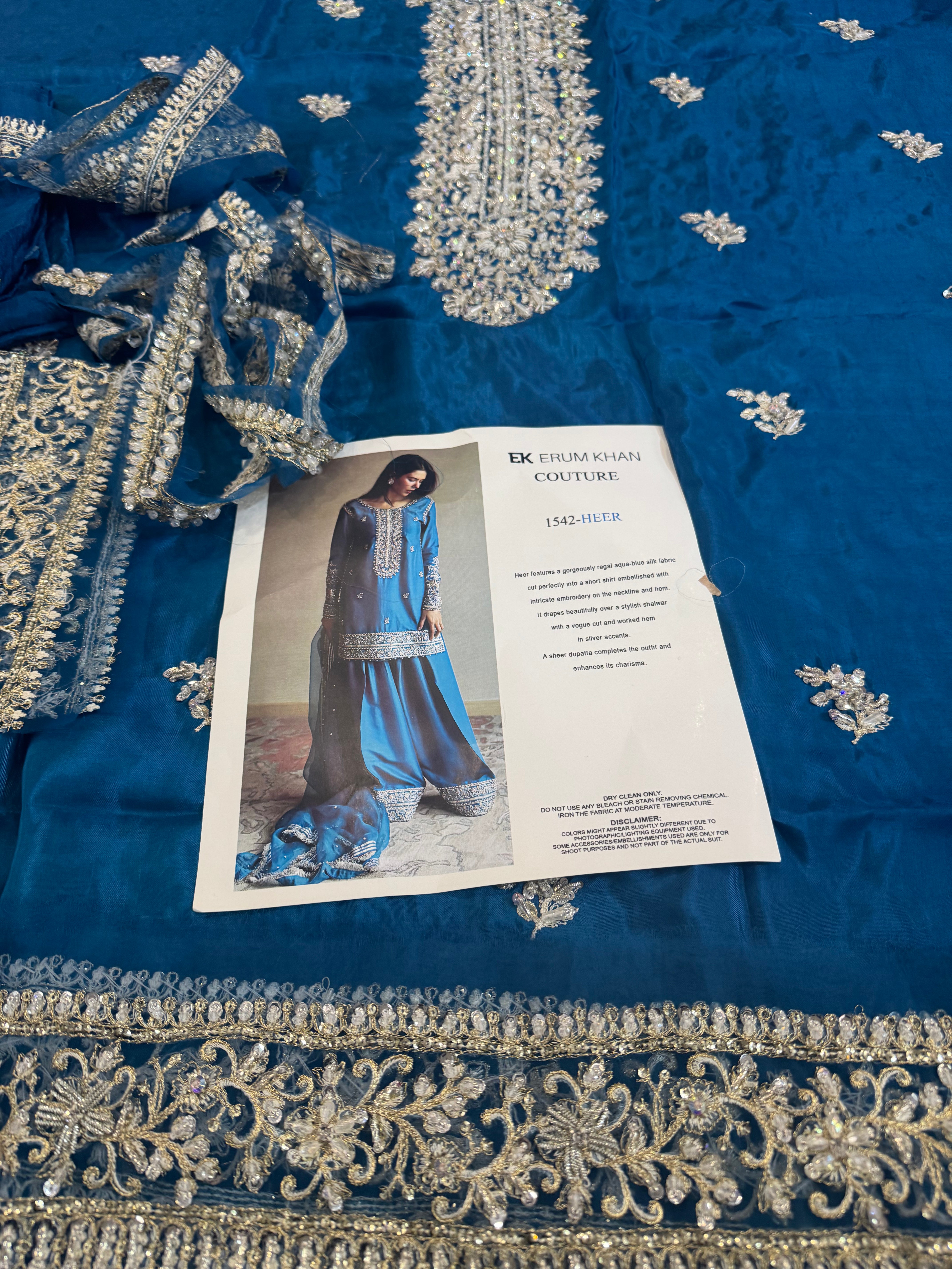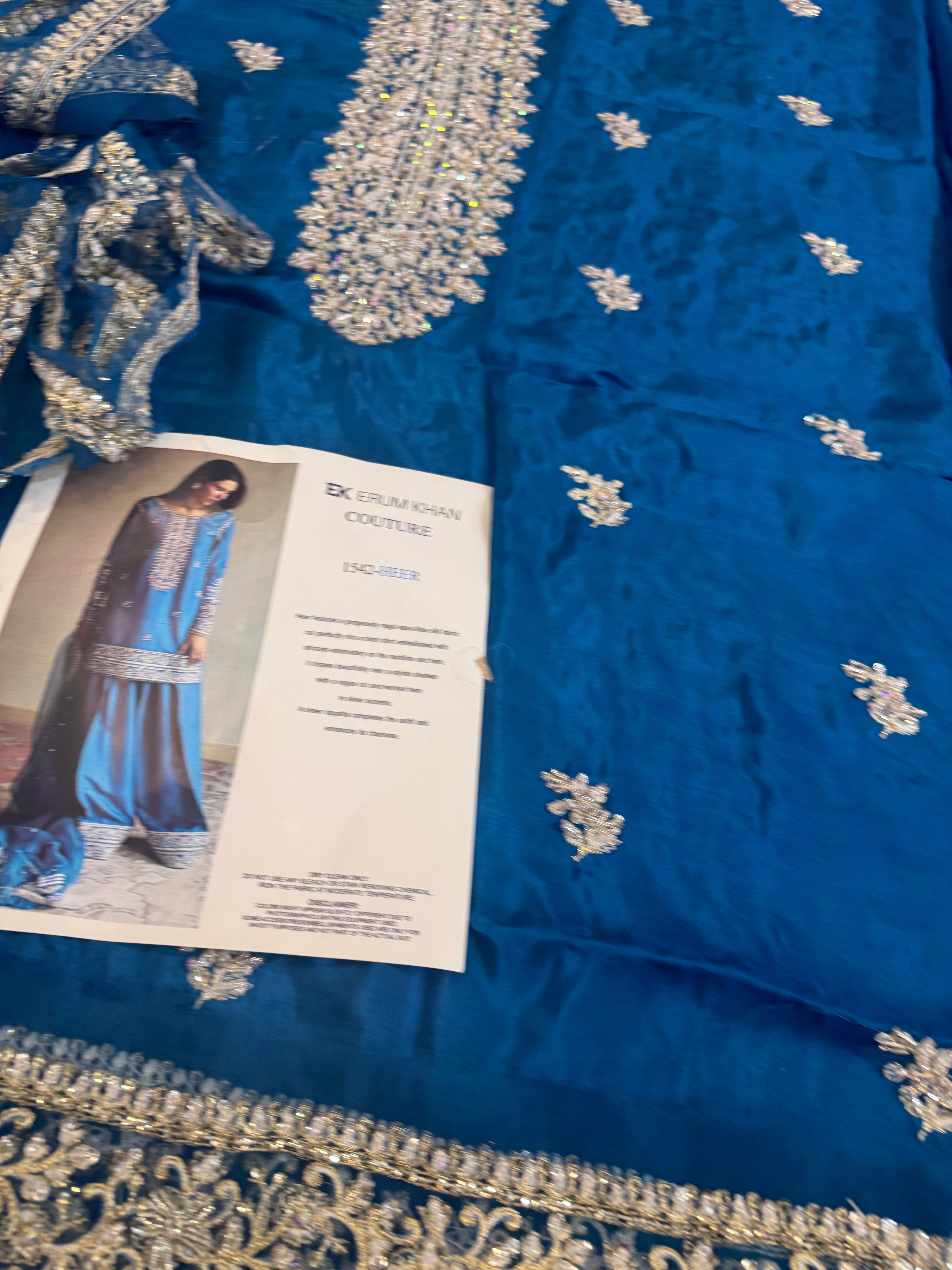 This exquisite ensemble, titled Erum Khan Wedding Edition, is a stunning piece from the designer's collection, featuring a vibrant electric blue color in a traditional Pakistani silhouette, categorized as a Chiffon Bridal outfit. The outfit consists of a short, straight-cut kameez (shirt) and a shalwar (trousers), both crafted from luxurious material, likely chiffon or raw silk based on the collection's theme, and heavily adorned with intricate silver or white embroidery, particularly around the neckline, cuffs, and hem of the shirt, and the bottom of the shalwar, paired with a sheer organza or chiffon dupatta (scarf) with coordinated detailing. The Brand is Erum Khan, and the product is held in the Erum Khan Inventory, with a listed Price of pkr 16,500 (likely in Pakistani Rupees, given the context of the brand and price point for a replica or an outfit from a specific collection).