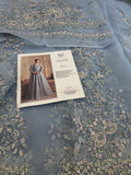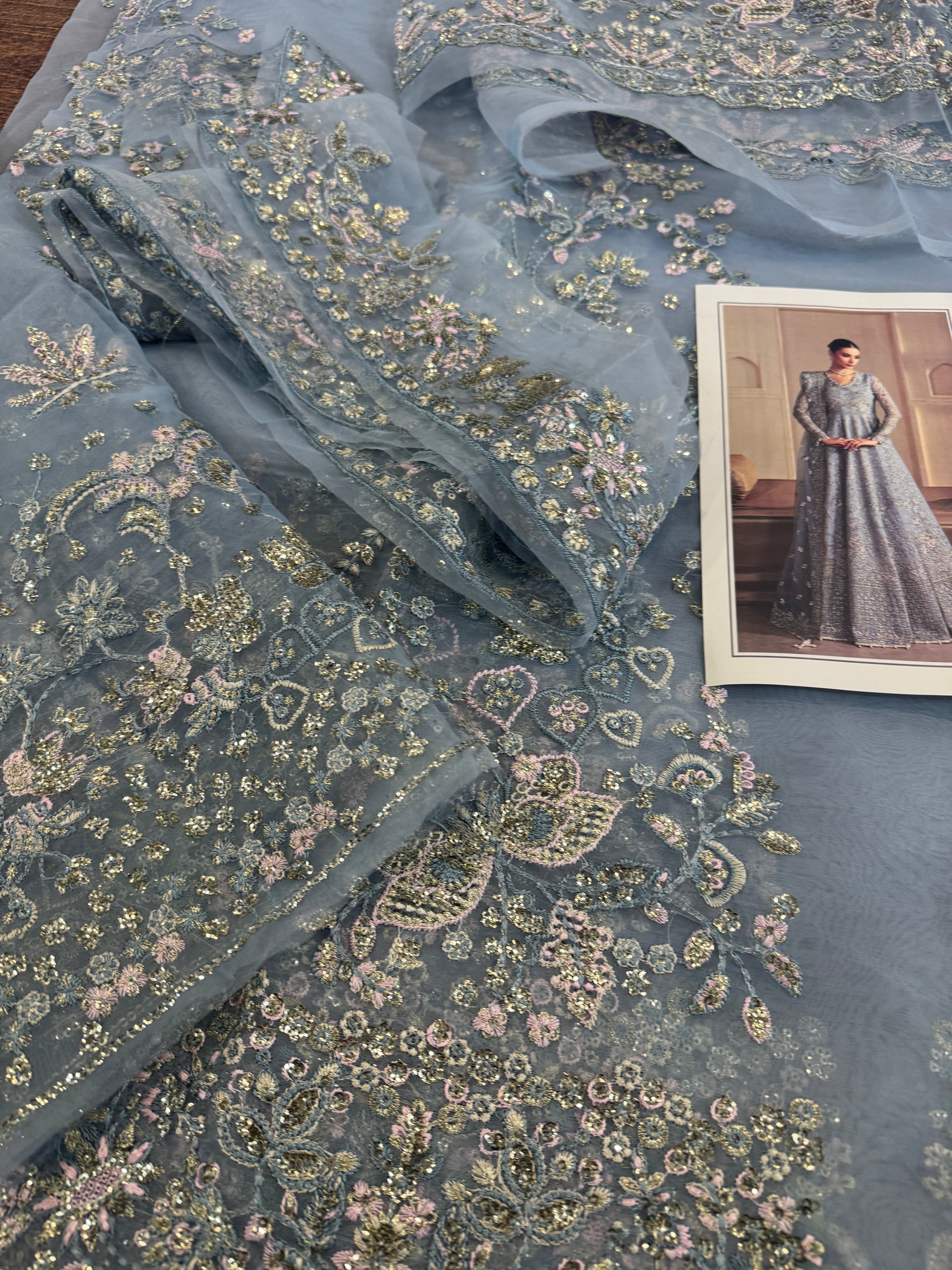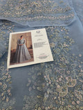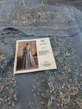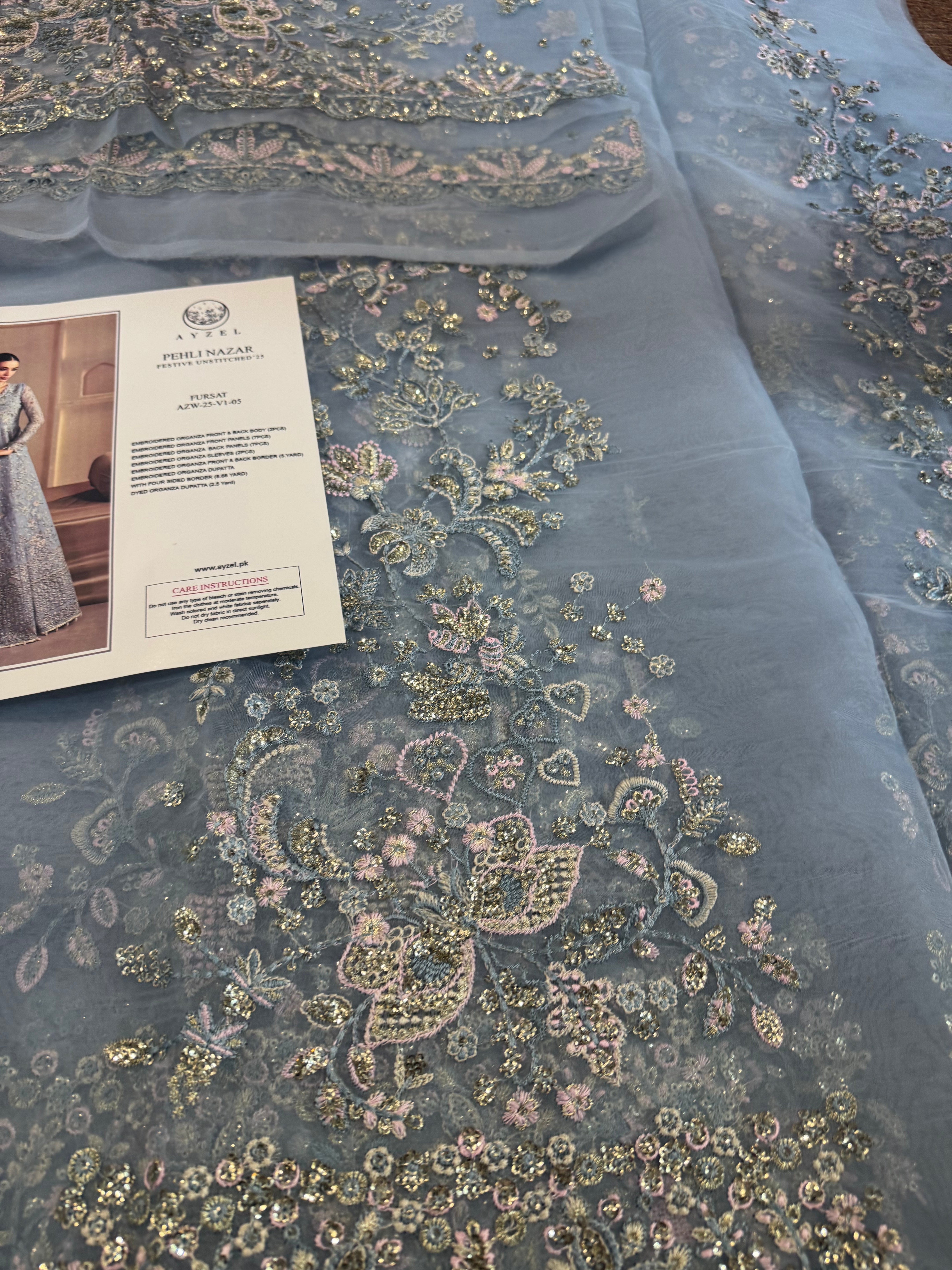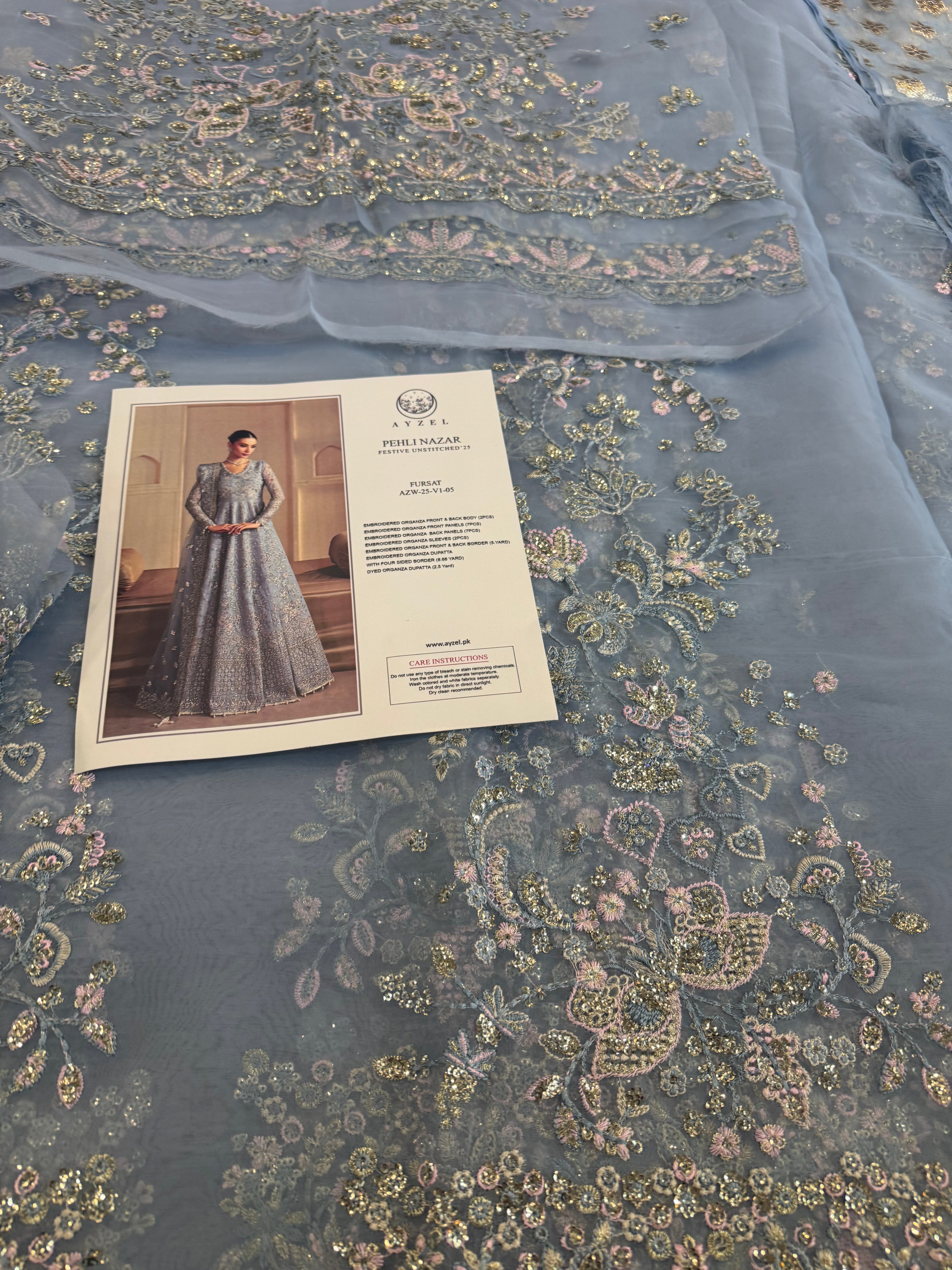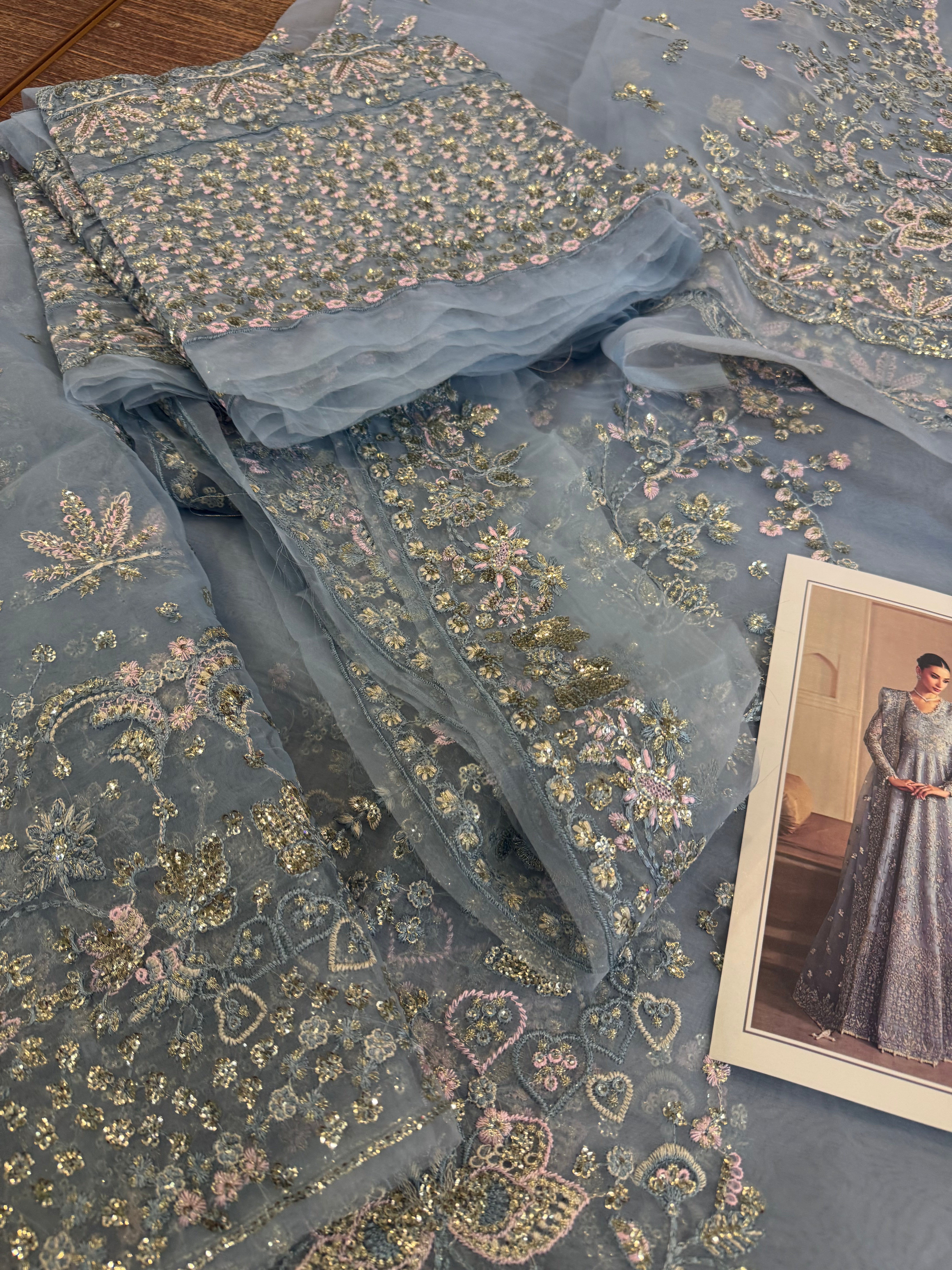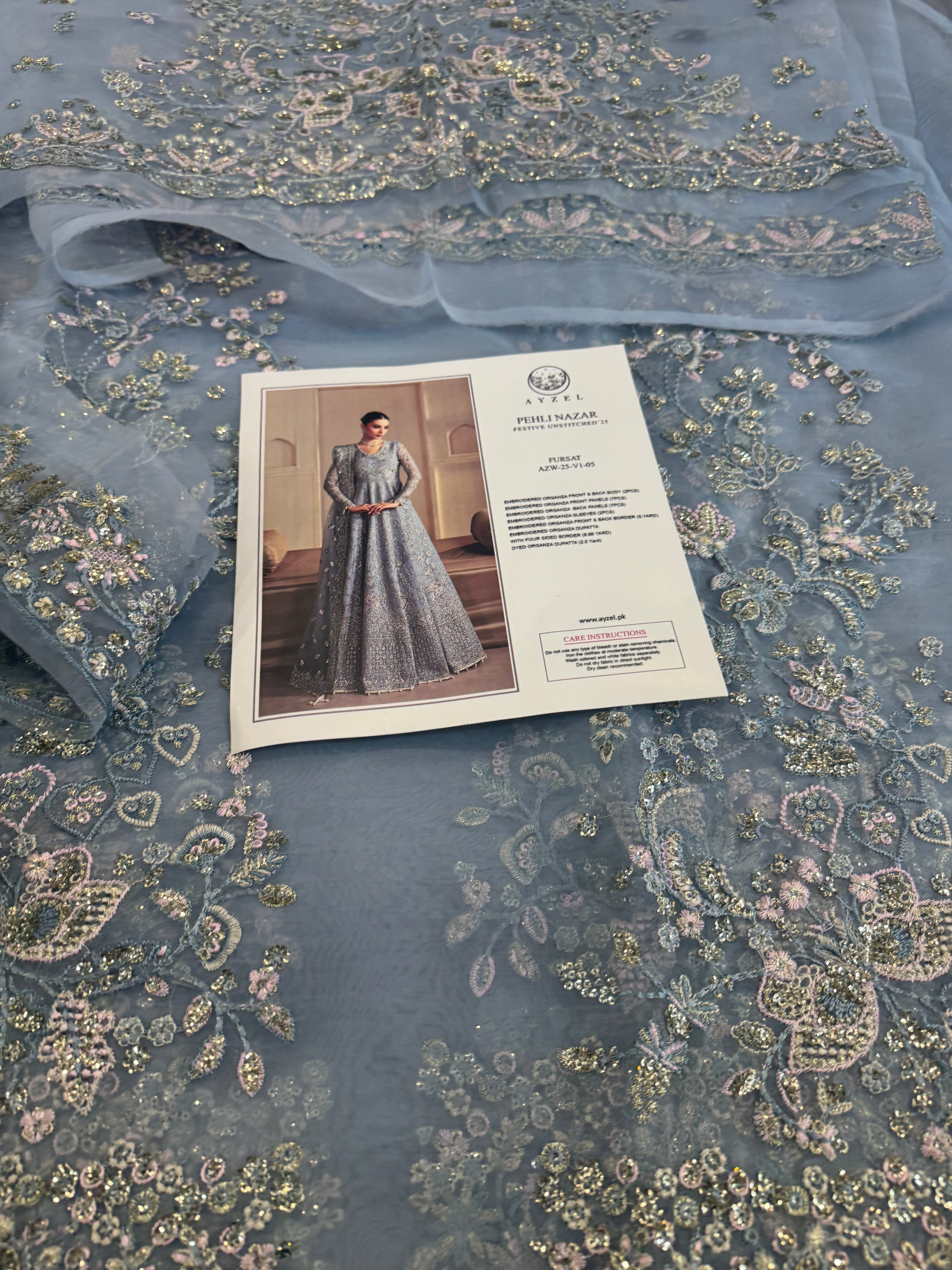 This stunning piece from the Ayzel Wedding Edition is a luxurious chiffon bridal ensemble, titled "Ayzel Sky." The floor-length dress is a breathtaking vision in sky blue, crafted from ethereal chiffon fabric and exquisitely adorned with intricate embroidery and delicate embellishments that shimmer across the long sleeves, fitted bodice, and voluminous skirt. The graceful silhouette and heavy formal work categorize it as a premium bridal outfit, capturing the essence of luxury couture for weddings and grand celebrations, and is priced at Rs. 13,500.