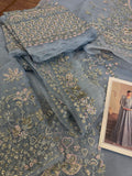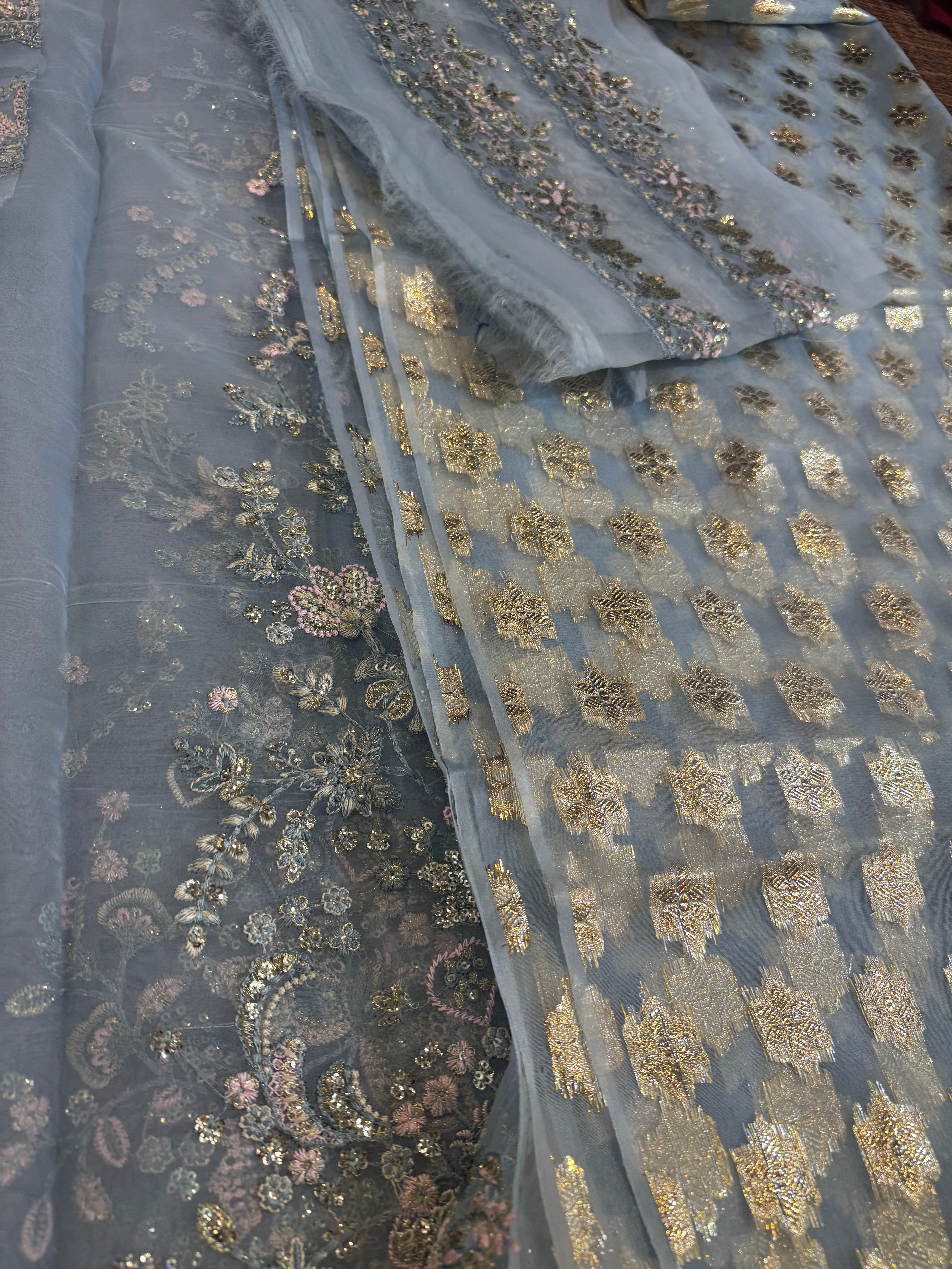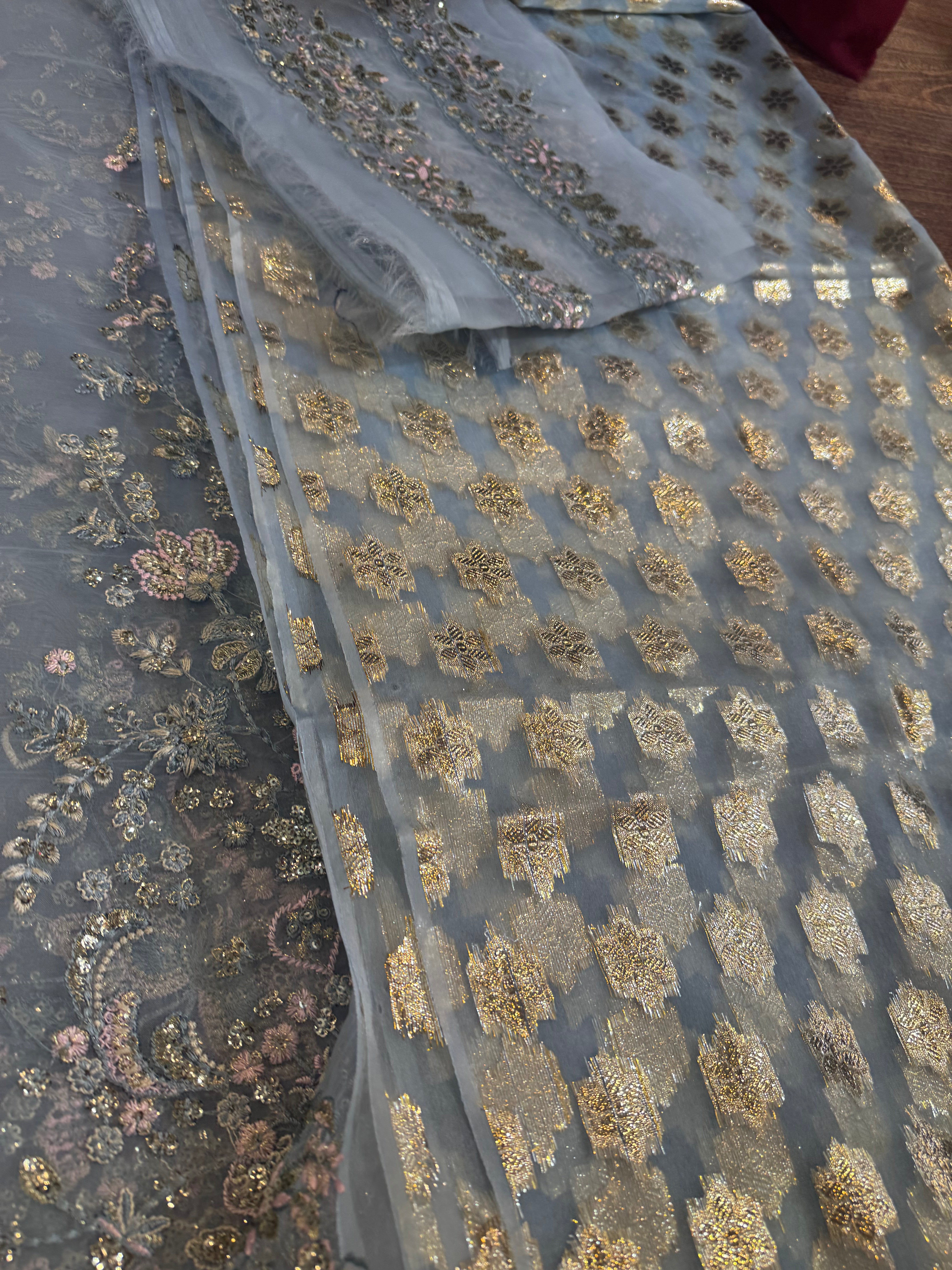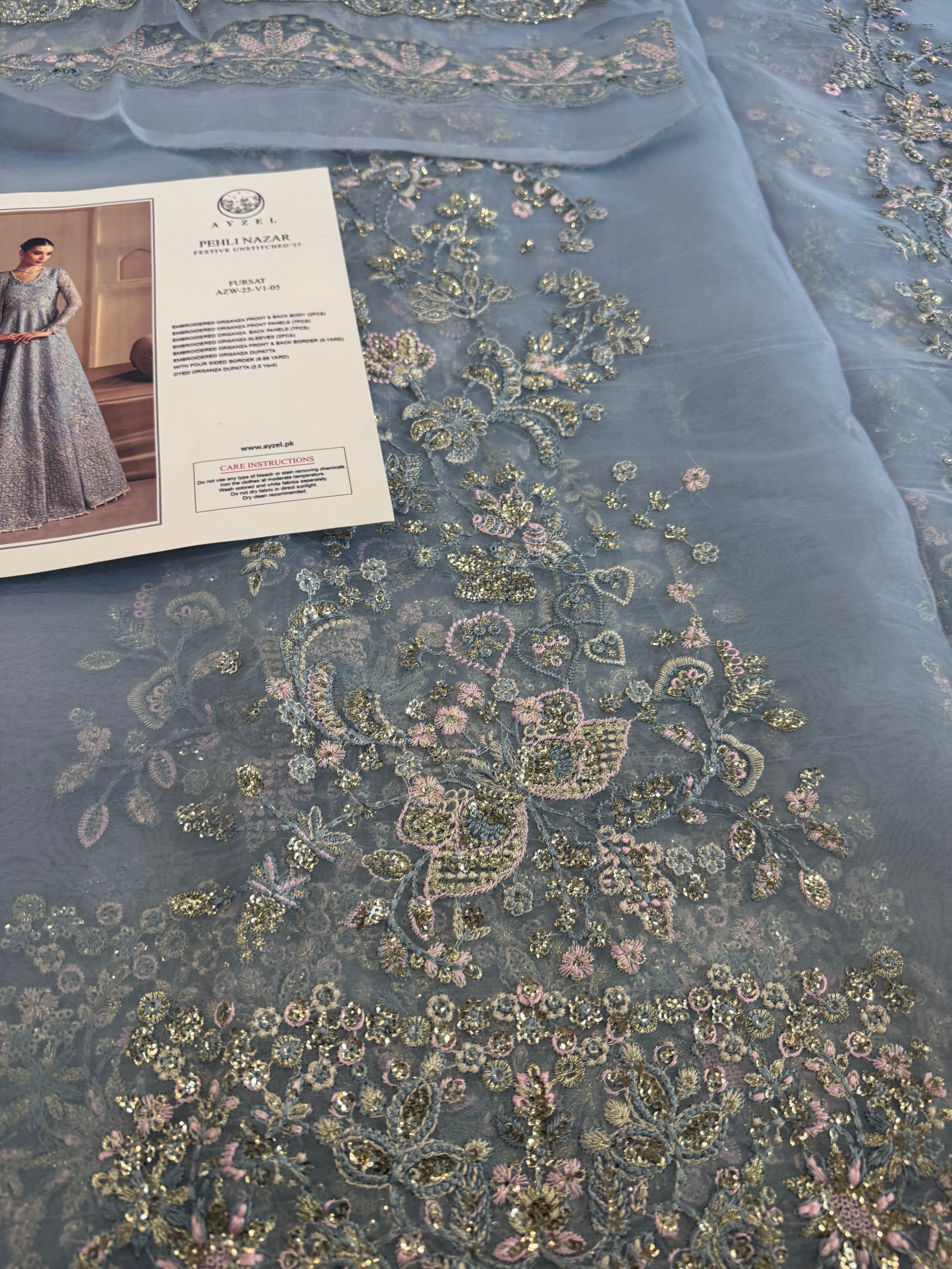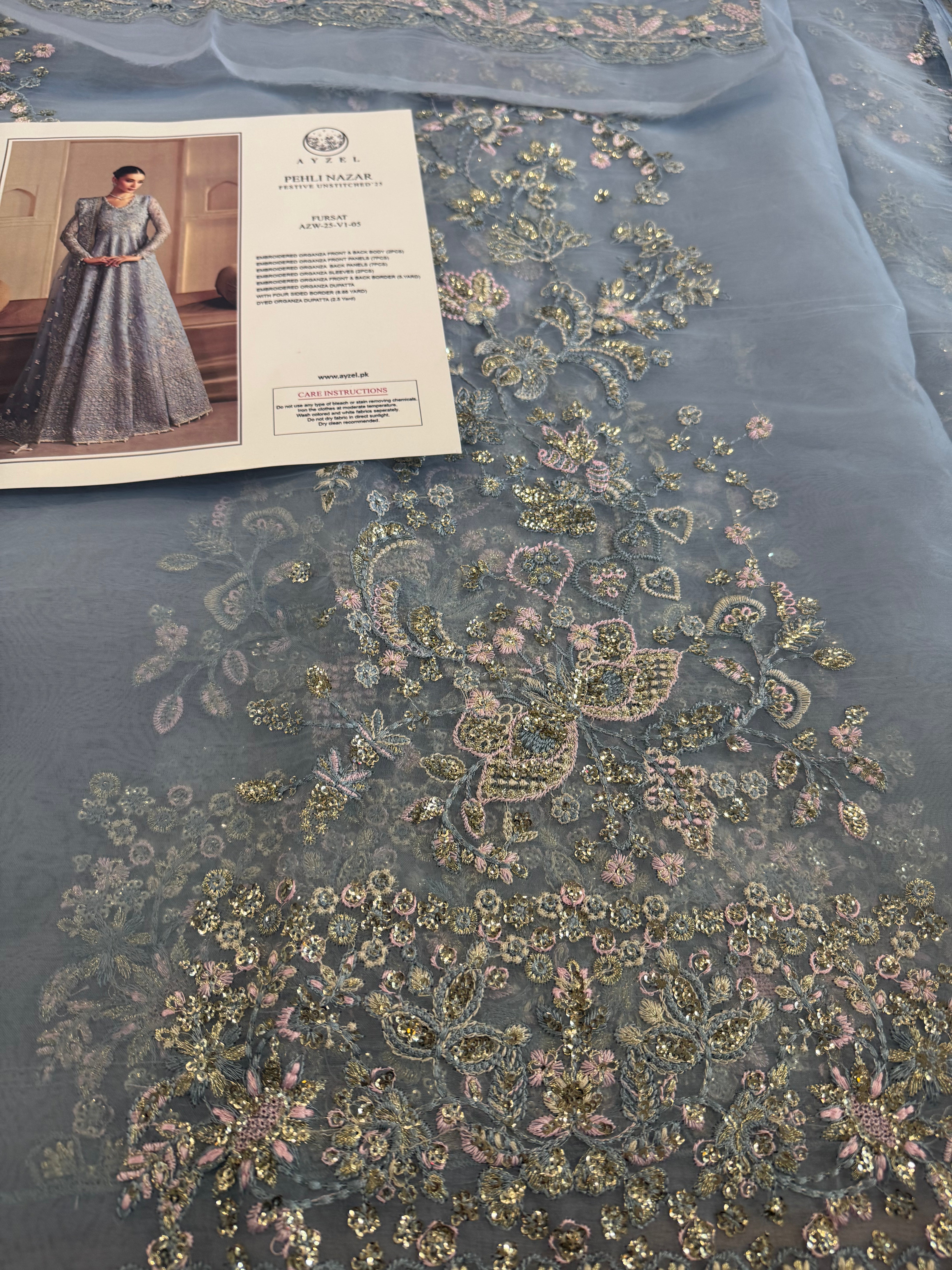 This stunning piece from the Ayzel Wedding Edition is a luxurious chiffon bridal ensemble, titled "Ayzel Sky." The floor-length dress is a breathtaking vision in sky blue, crafted from ethereal chiffon fabric and exquisitely adorned with intricate embroidery and delicate embellishments that shimmer across the long sleeves, fitted bodice,...