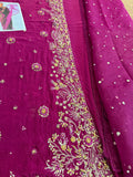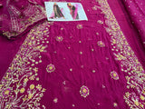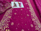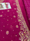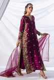 Elevate your festive wardrobe with this stunning deep plum ensemble from the Batik Wedding Edition. Meticulously crafted for the modern bride, this chiffon bridal outfit features a long-silhouette shirt adorned with intricate gold zardozi and tilla embroidery, highlighted by delicate floral motifs and shimmering sequin embellishments that cascade down the side slits and hem. The regal V-neckline and richly worked sleeves exude timeless elegance, making it an ideal choice for weddings and formal evening galas. Paired with a lightweight, sheer dupatta featuring an embroidered spray and finished with a refined gold border, this ensemble strikes the perfect balance between traditional craftsmanship and contemporary style. Available for 16,500, this masterfully designed piece ensures a majestic presence at any high-profile event.