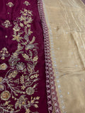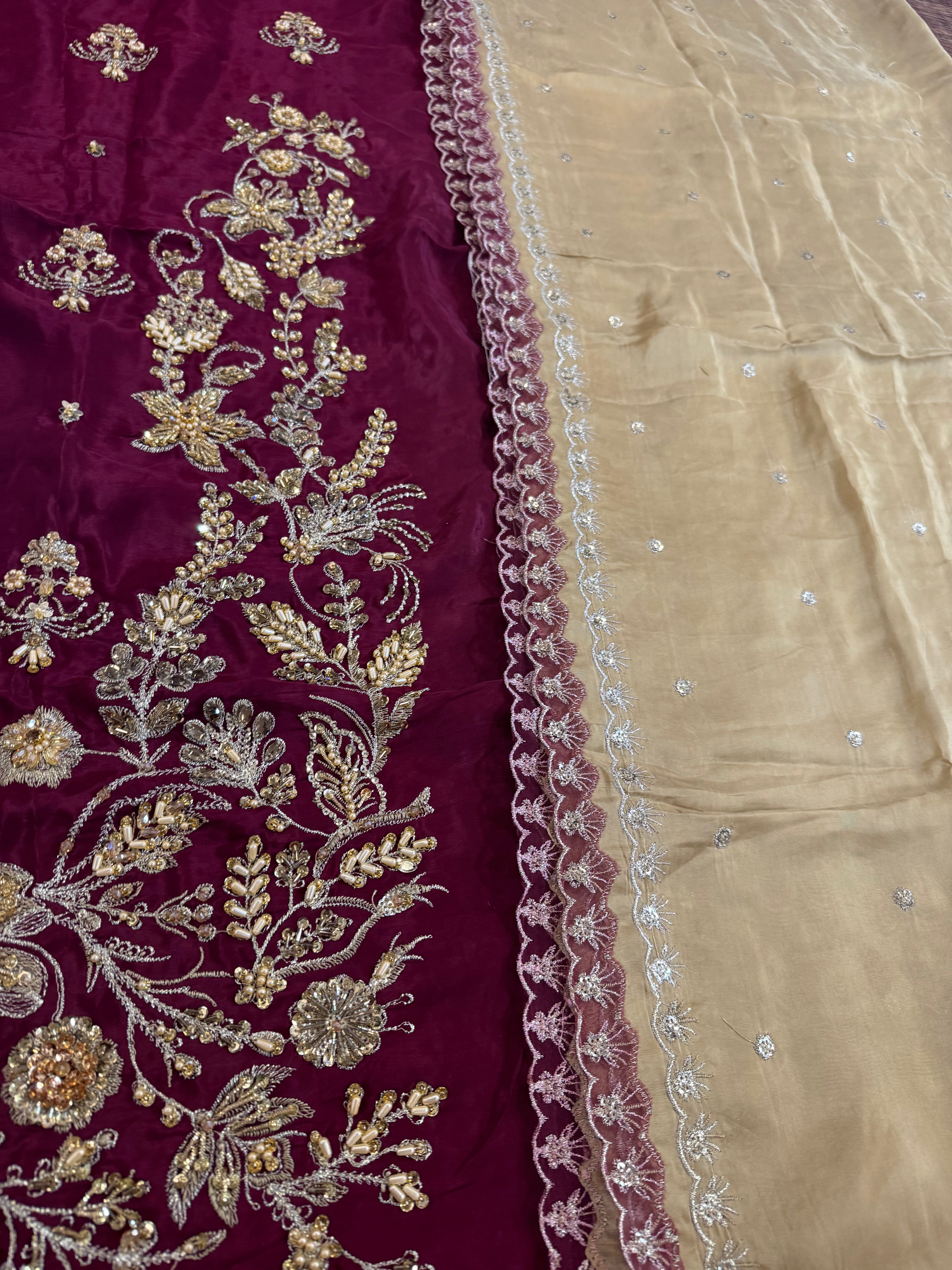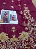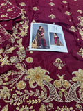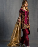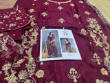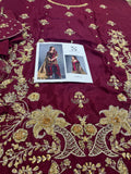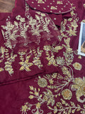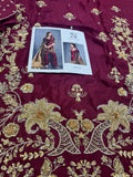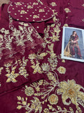 Indulge in opulent bridal elegance with this signature bridal ensemble from Sehrish Nadeem, crafted on flowing chiffon in a rich burgundy hue and lavishly detailed with intricate gold thread embroidery and sequins. The straight-cut shirt features elaborate all-over floral and paisley motifs, while the matching straight trousers offer sleek sophistication. A sumptuous gold chiffon dupatta completes the look—lightweight yet striking—draping beautifully to add regal movement and shine. Designed for the modern bride who honours traditional craftsmanship, this ensemble ensures you shine in every frame and make a timeless statement. Available now for PKR 16,500—your edition of grandeur from House of Sehrish Nadeem.
