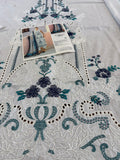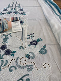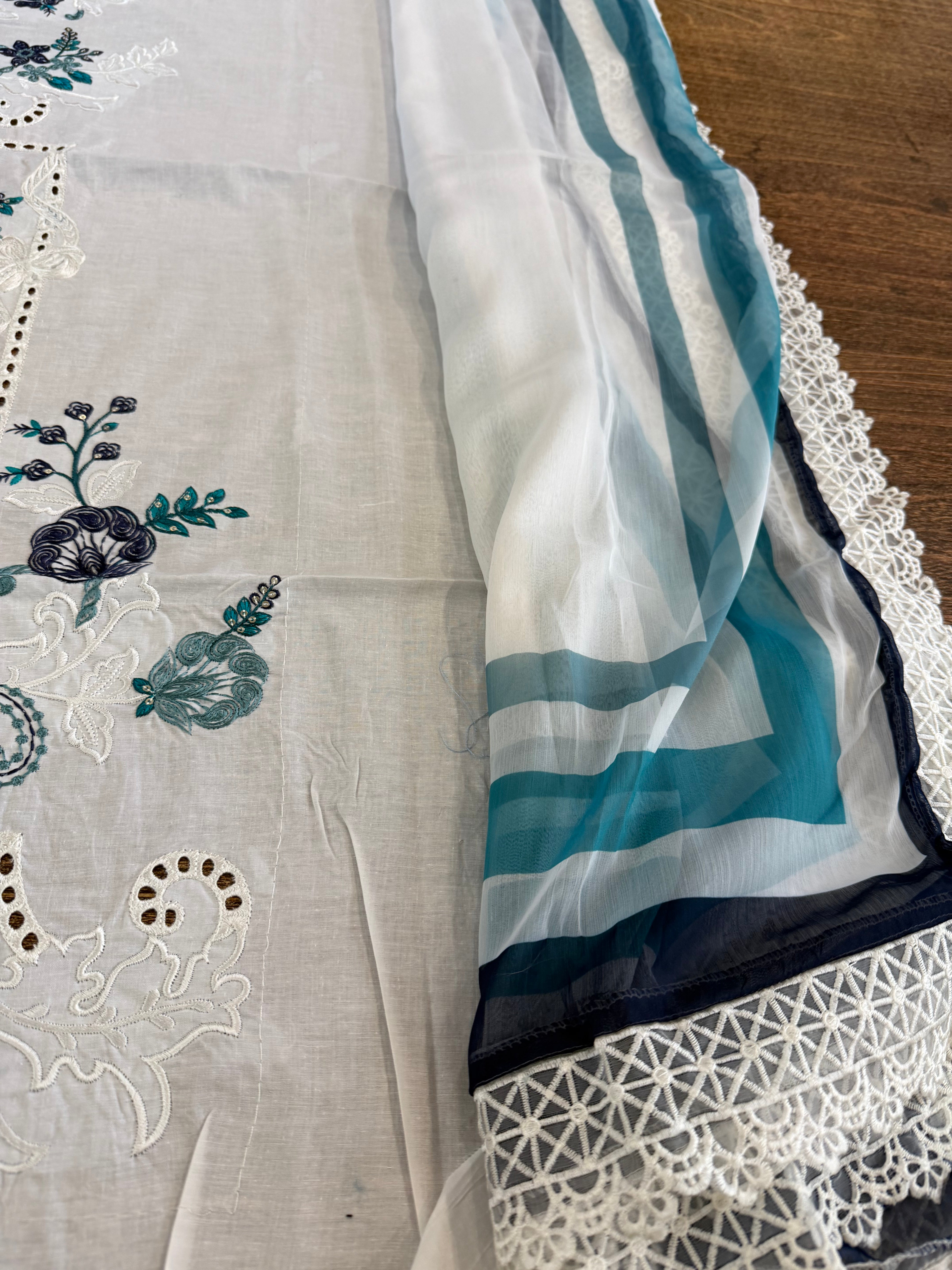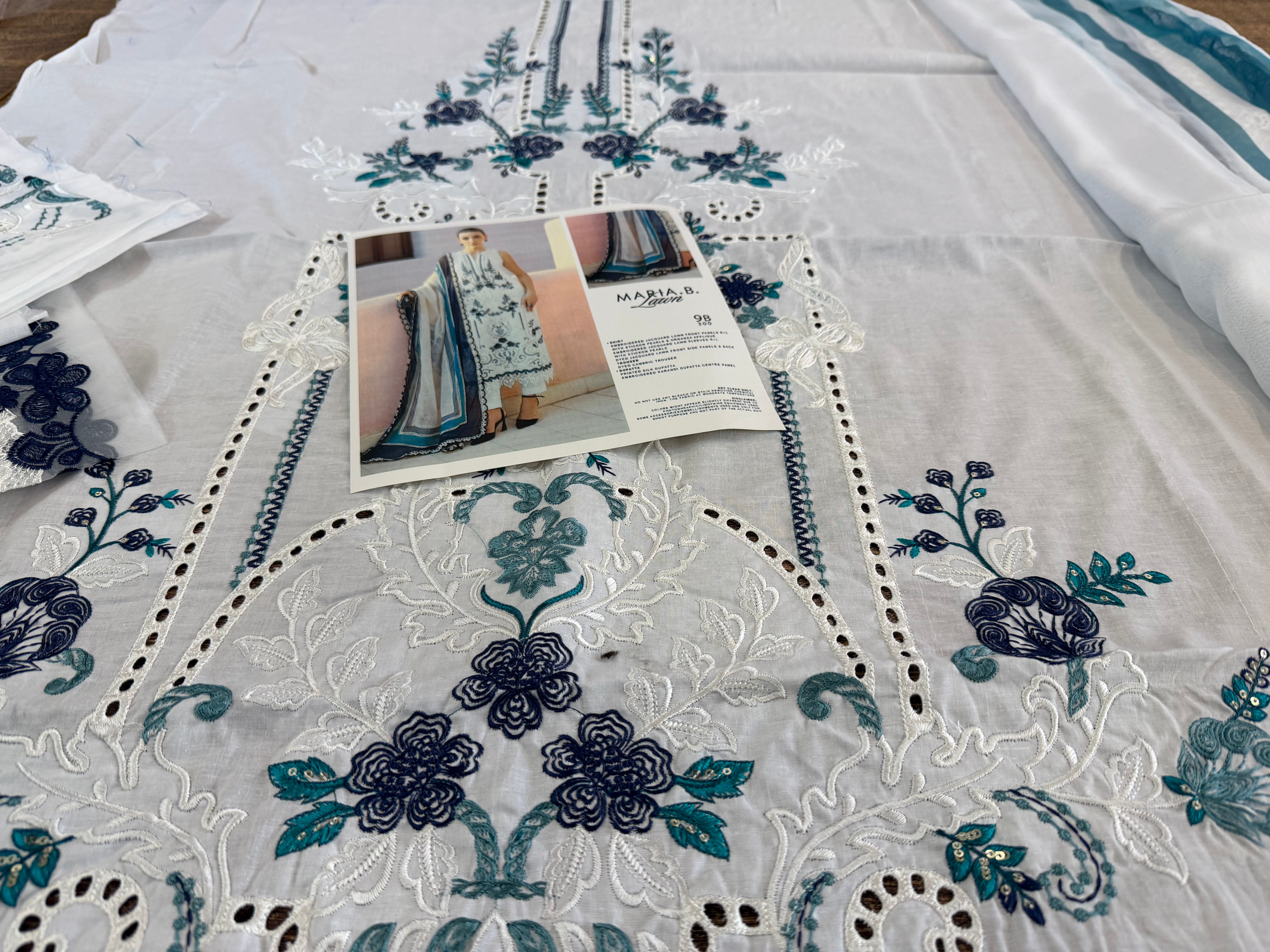 Elevate your summer wardrobe with the Maria B Luxury Lawn 2026 (Design 9B), a masterpiece of contemporary Pakistani fashion that blends timeless grace with modern flair. This stunning unstitched 3-piece suit features a pristine white embroidered jacquard lawn shirt, intricately adorned with delicate blue floral motifs, stick-on pearls, and exquisite organza appliqué for a touch of opulence. The ensemble is perfectly complemented by a vibrant printed silk dupatta featuring deep teal and navy accents, and classic dyed cambric trousers that ensure both comfort and style. Whether you're dressing for a festive Eid brunch or a sophisticated summer evening, this Maria B White & Blue edition from the latest lawn collection offers the breathable luxury and artisanal craftsmanship that the brand is celebrated for—all at an incredible value of 8500.