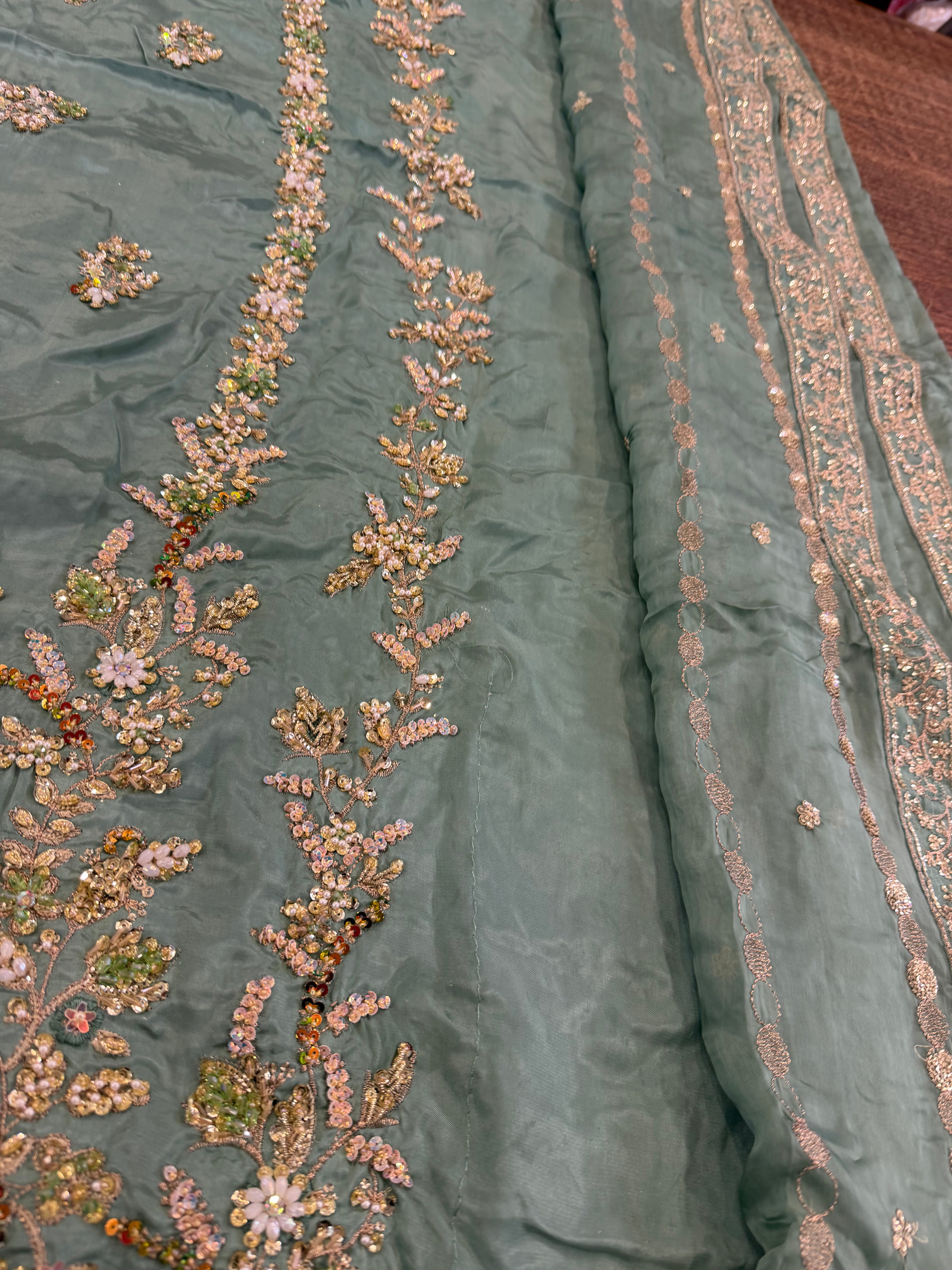 Embrace timeless elegance with the Vintage Wedding Edition by Vintage, a masterpiece designed for the modern bride who appreciates classic sophistication. This exquisite Sea Green ensemble is meticulously crafted from premium chiffon, featuring intricate, high-density embroidery and delicate hand-embellished details that catch the light at every angle. The soft, ethereal drape of the sea green chiffon paired with its rich bridal craftsmanship makes it an ideal choice for walimas, nikkahs, or festive wedding receptions. Elevate your bridal wardrobe with this signature piece that blends traditional artistry with a contemporary silhouette, ensuring you stand out with grace and poise on your special day.