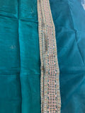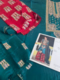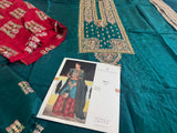 This exquisite Chiffon Bridal ensemble from the Hussain Rehar Wedding Edition collection is a striking blend of traditional elegance and modern design. The outfit features a rich green shirt with intricate gold embroidery and embellishments, paired with vibrant red trousers adorned with a matching pattern. The outfit is completed with a deep green chiffon dupatta, which also features detailed embroidery along its borders, creating a cohesive and luxurious look perfect for any special occasion. This specific product, known by the inventory name "HR Green Red," is available for a price of 18,500.