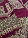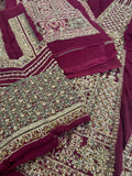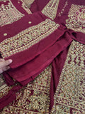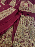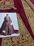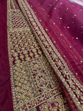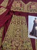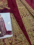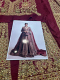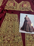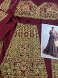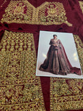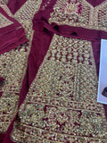 This product is a breathtaking red bridal ensemble by Hussain Rehar, falling under the category of Chiffon Bridal wear, though the intricate embellishments suggest it may incorporate raw silk or other fabrics as seen in the brand's luxury collections. The vibrant red outfit, detailed with heavy traditional embroidery, beadwork, and embellishments in shades of gold, features a long, deep V-neck jacket-style open front with full sleeves, layered over a heavily detailed inner garment, likely a lehenga or a similar flowing silhouette, and is completed with a coordinating heavily embellished dupatta, and is being offered with the associated inventory tag of Hussain Rehar Red at an approximate price of pkr38,500.
