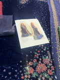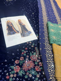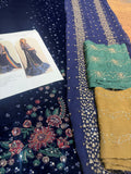Step into the spotlight with this exquisite ensemble from the Jazmin Wedding Edition, a masterpiece of craftsmanship designed for the modern bride. This Jazmin Blue Chiffon Bridal outfit features a deep navy blue shirt meticulously adorned with intricate floral embroidery and shimmering sequin detailing that flows into a majestic, multi-layered ruffled organza lehenga. The look is perfectly balanced by a luxurious chiffon dupatta boasting vibrant, multi-colored borders and delicate gold spray, offering a regal aesthetic that is both traditional and trend-setting. Priced at 17,500, this premium three-piece suit combines high-quality fabric with sophisticated design, making it an essential addition to your wedding wardrobe for those seeking elegance and a striking silhouette