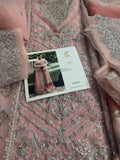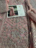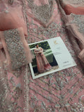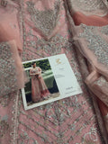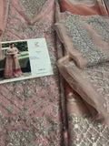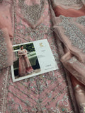 This exquisite pink bridal outfit from the Kanwal Malik Wedding Edition is a stunning ensemble in chiffon, perfect for making an elegant statement at any wedding or formal event. The dress features a long, flowing silhouette with intricate silver embroidery and embellishments, likely including a knee-length or longer shirt/kurta over a matching flared garment such as a gharara or wide-leg trouser, complete with a beautifully embellished dupatta. The subtle pink hue, elaborate detailing, and traditional Pakistani bridal wear craftsmanship capture a regal and sophisticated look, priced at PKR 20,500.