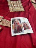 This exquisite garment from the Kanwal Malik Wedding Edition, categorized as a chiffon bridal ensemble, features a stunning rich crimson color, denoted by the inventory name "KM Red." The outfit, priced at \text{Rs.16,500} (or a comparable price point based on similar listings), is a beautifully detailed three-piece set that typically includes a sleeveless short shirt and flared trousers adorned with intricate hand embellishments and delicate gold embroidery, paired with a heavily embroidered dupatta and often a matching pouch, reflecting the brand's mastery of opulent South Asian formal wear perfect for weddings and festive occasions.
