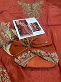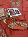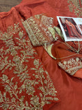 Unveil timeless elegance with the Kanwal Malik Wedding Edition in the stunning KM Rust shade, available for approximately Rs. 17,000. This exquisite ensemble from the Kanwal Malik brand features a richly embroidered long shirt, coordinating trousers, and a heavily adorned dupatta, all in a beautiful rust color. While some versions of the KM Rust outfit are noted as being crafted in luxury raw silk with intricate hand embellishment, this style is representative of the designer's formal wedding wear collections, which also include luxurious materials like chiffon, suitable for a bridal or formal occasion. The look is complete with a matching embellished potli bag (as seen in the image), making it a perfect, regal statement for weddings.