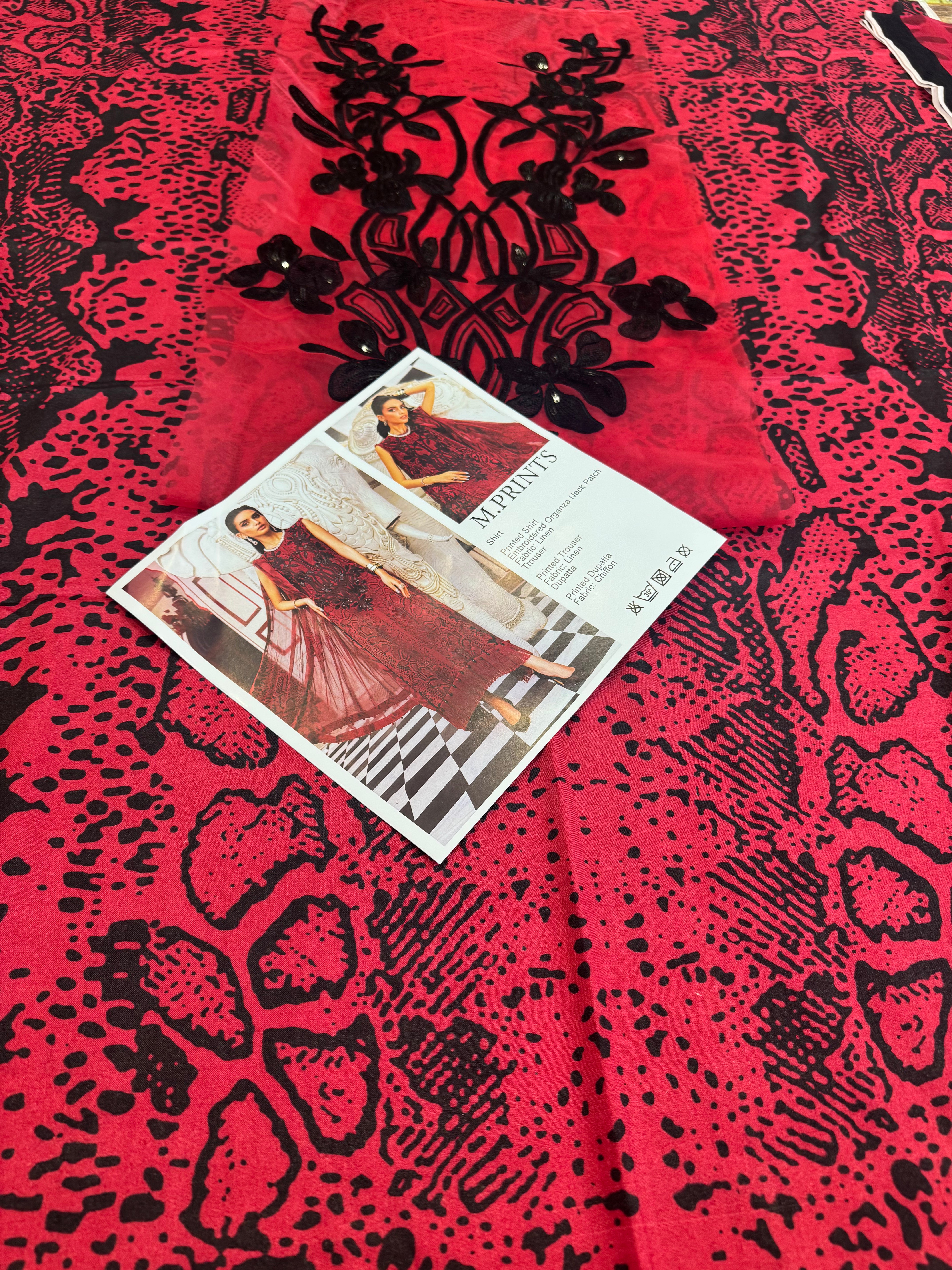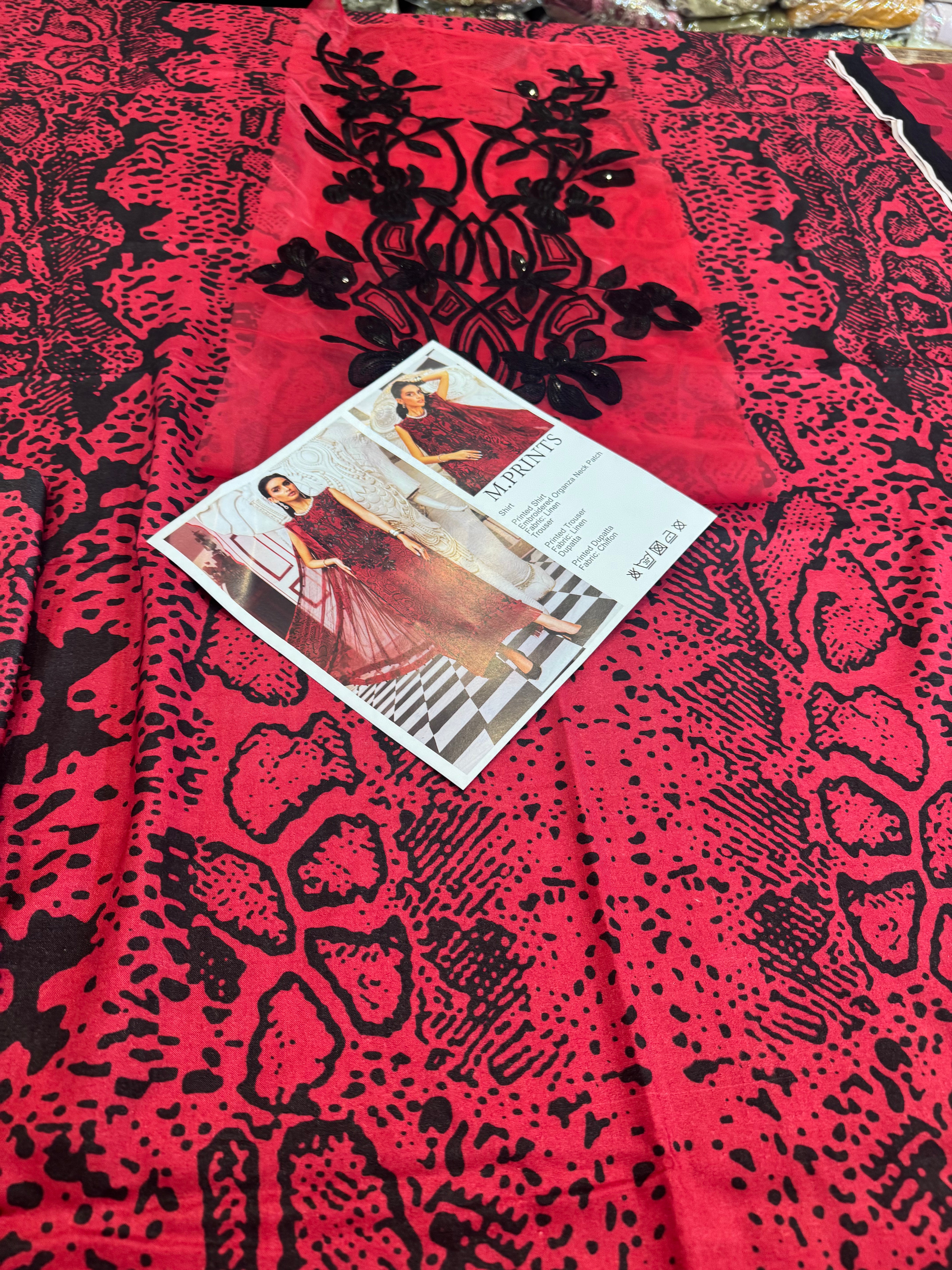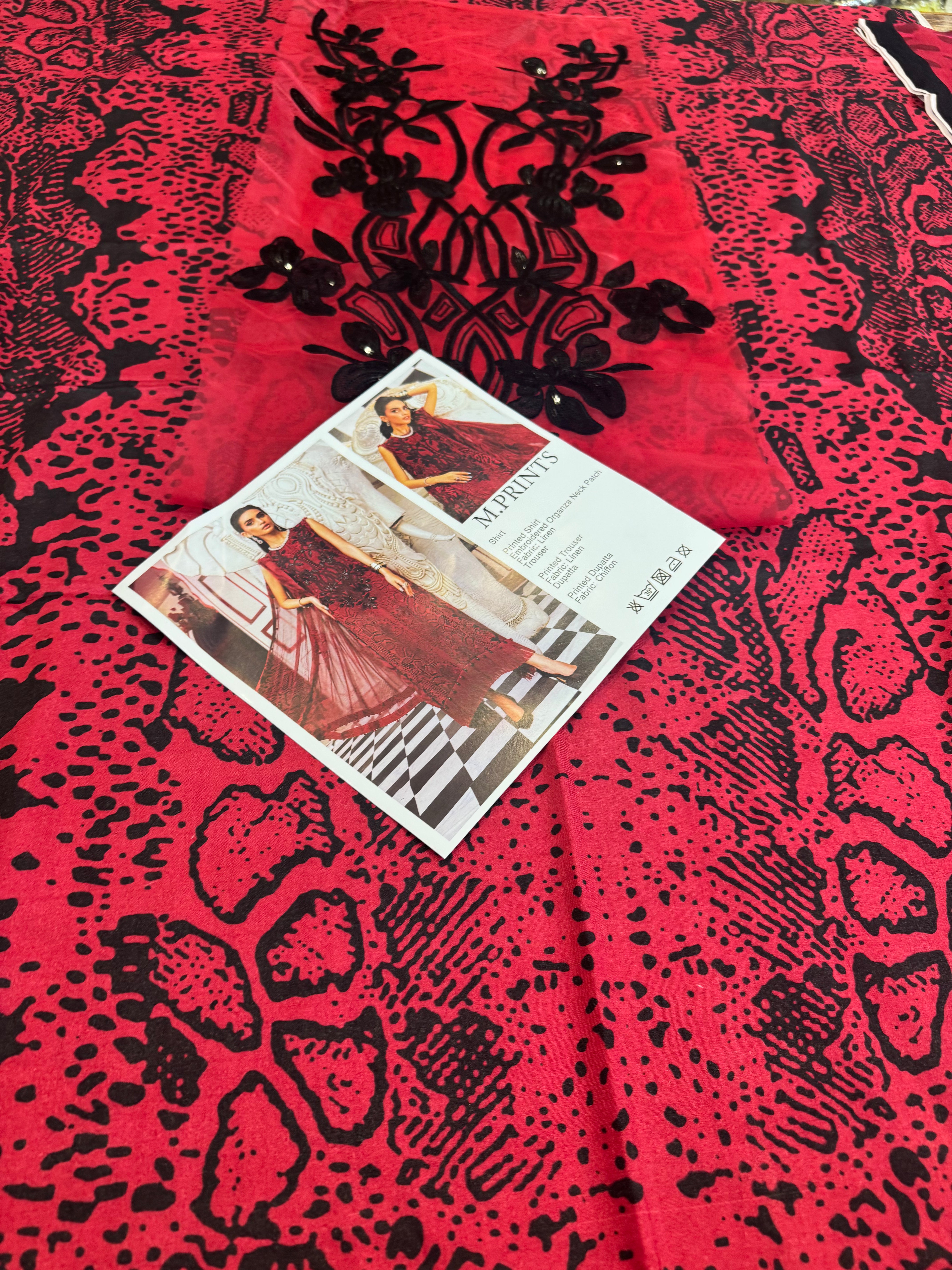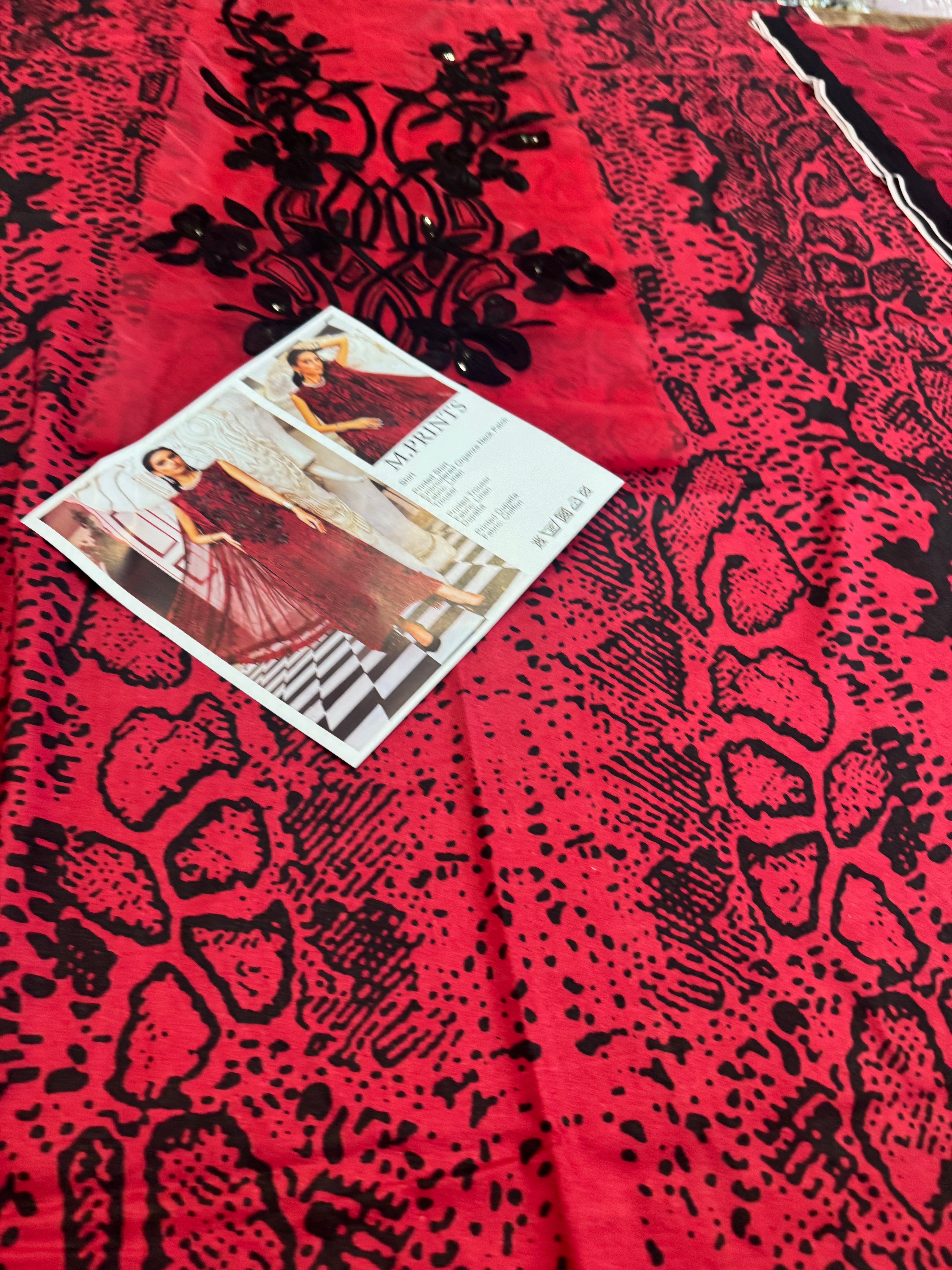 This striking ensemble is an opulent piece from the Maria B Winter Collection, categorized under Chiffon and identified by the inventory code, possibly related to mprint red black or style number 2A. The dress features a deep, rich red base fabric, likely chiffon, which is elegantly contrasted with intricate black embroidery and detailing down the center, possibly incorporating a printed or woven texture within the red areas. Priced at Rs. 6,750, this three-piece suit showcases a floor-length silhouette with a heavily embroidered sleeveless kameez and a sheer, flowing dupatta, representing a blend of luxurious traditional design and seasonal sophistication perfect for formal winter events.