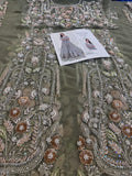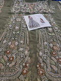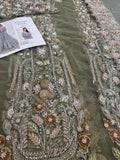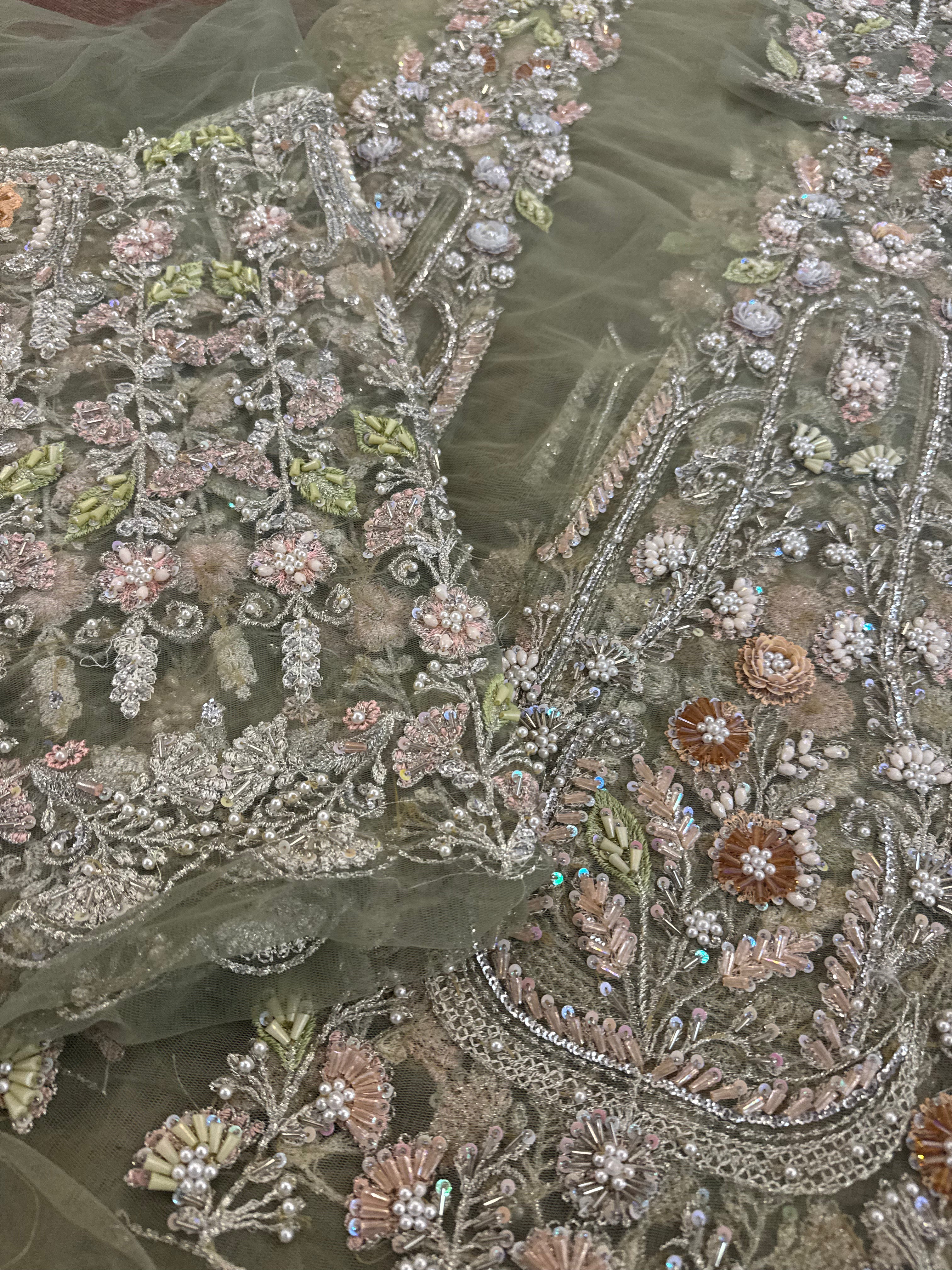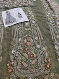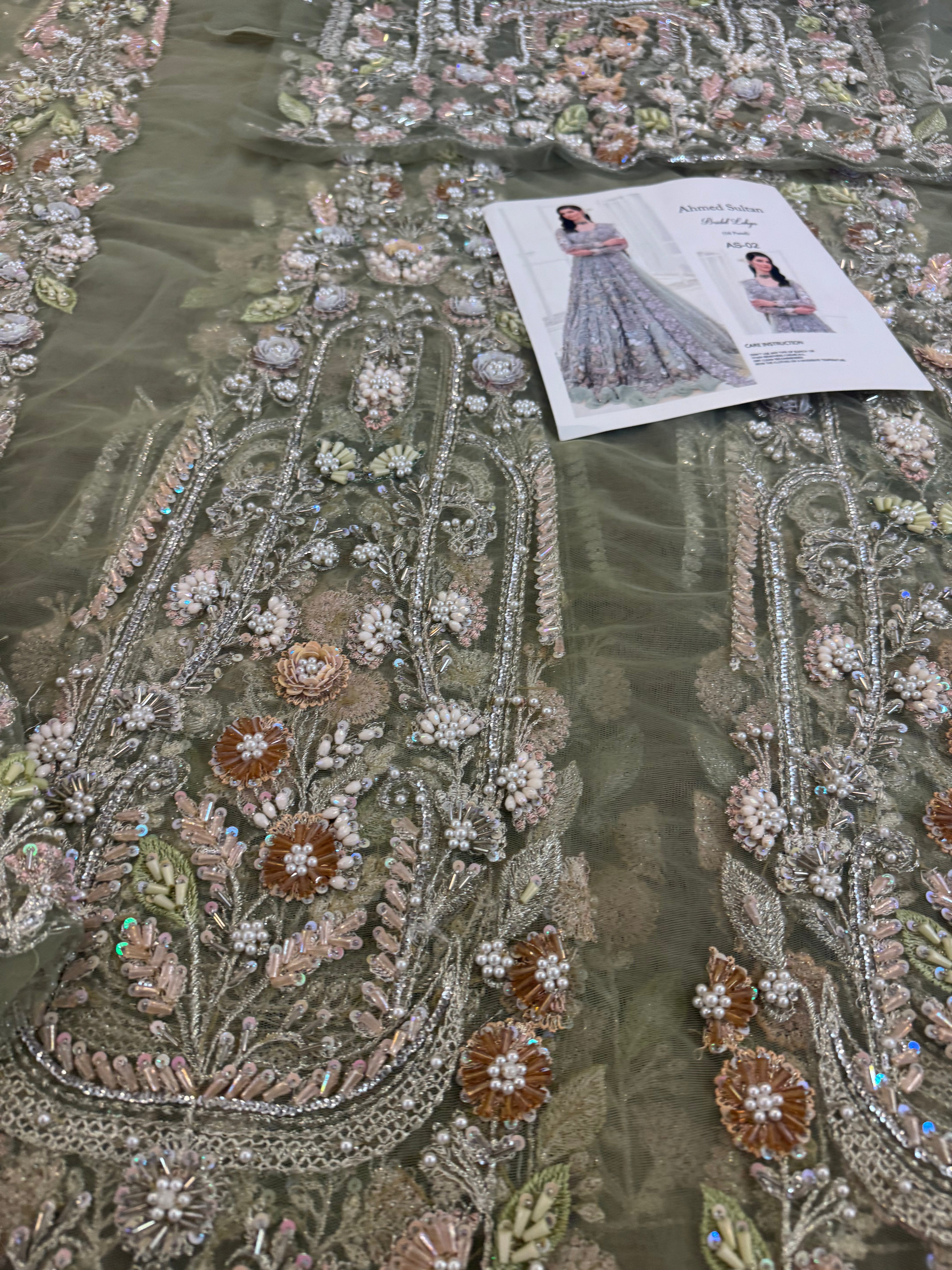 Presenting the exquisite Ahmad Sultan Wedding Edition 16-Panelled Chiffon Bridal gown, this masterpiece features a delicate pista green hue, lavishly adorned with intricate multi-colored embroidery and sparkling hand-embellishments throughout the voluminous 16-panelled flair. The dress is crafted from luxurious chiffon, offering a regal silhouette that is complemented by a scalloped,...