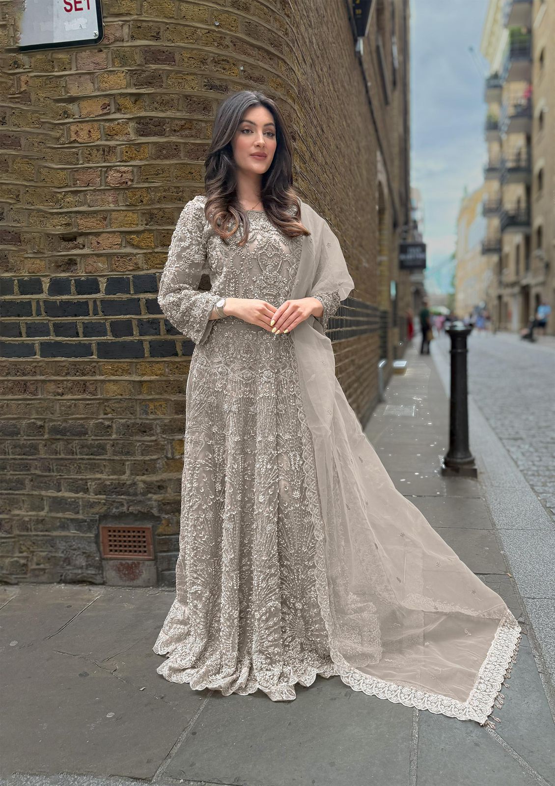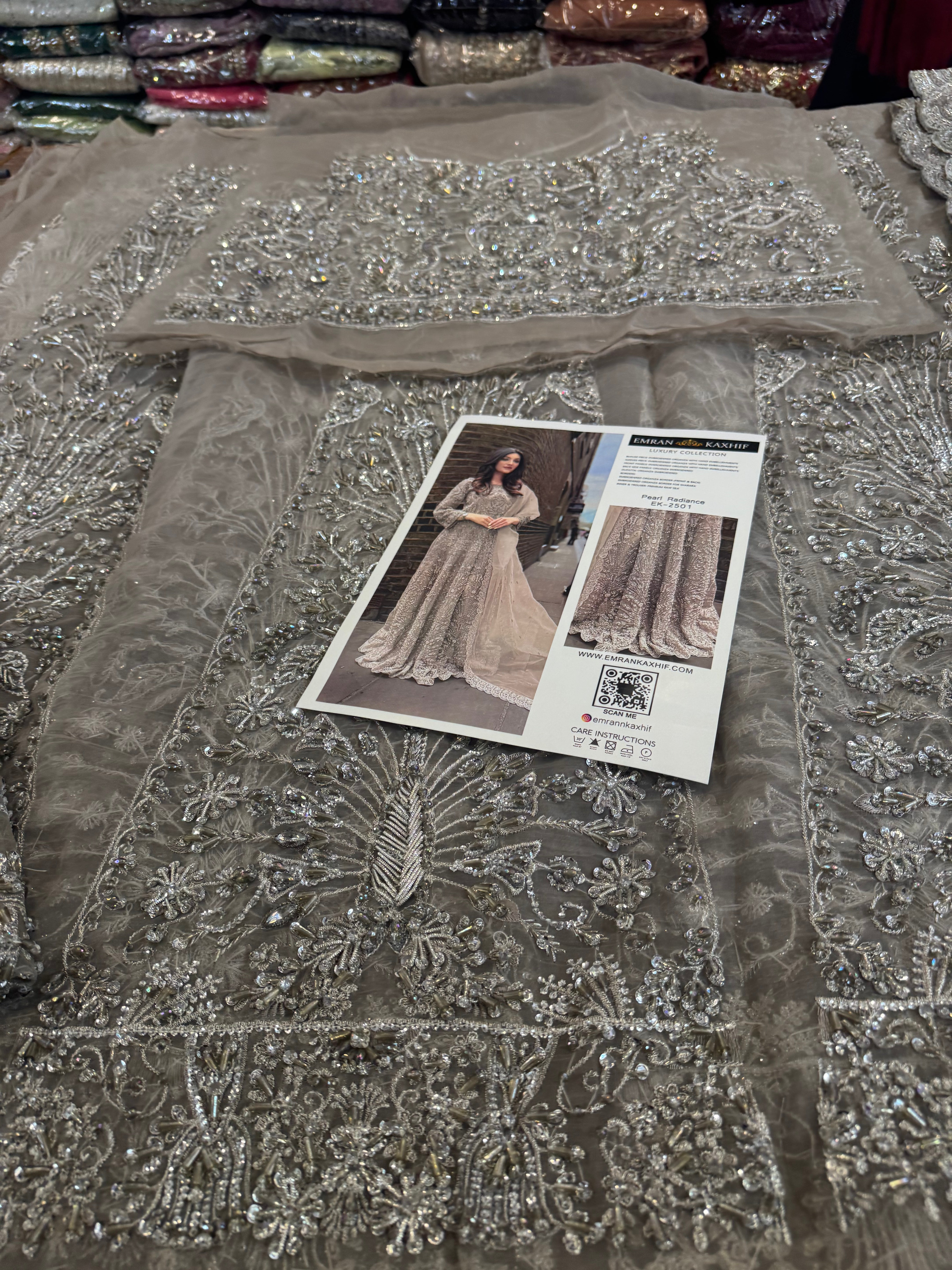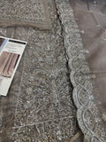 This stunning Emran Kashif wedding edition chiffon bridal gown is a magnificent example of original Emran Kashif design. This elegant Emran Kashif mouse dress, priced at 26500, is a perfect choice for any special occasion. The intricate embroidery and beautiful design on the flowing chiffon fabric create a truly ethereal look, complemented by a matching sheer dupatta with a delicate lace border.