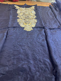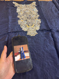 This elegant product from the Hussain Rehar Wedding Edition is a striking deep blue chiffon bridal ensemble. Titled "HR Blue," the three-piece outfit features a long-sleeved kurta with a heavily embroidered and embellished front and cuffs, along with wide-leg trousers and a coordinating dupatta. The intricate floral and traditional embroidery in white, pink, and green adds a beautiful contrast to the rich blue fabric. This sophisticated and opulent outfit is a perfect blend of traditional craftsmanship and contemporary style, available for a price of 15500.