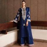 This elegant product from the Hussain Rehar Wedding Edition is a striking deep blue chiffon bridal ensemble. Titled "HR Blue," the three-piece outfit features a long-sleeved kurta with a heavily embroidered and embellished front and cuffs, along with wide-leg trousers and a coordinating dupatta. The intricate floral and traditional embroidery...