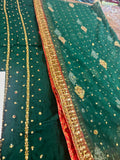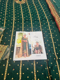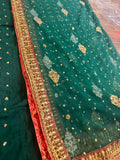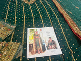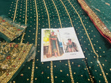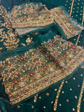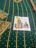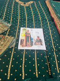 This exquisite Haris Shakeel wedding edition outfit is a stunning choice for any bride. The ensemble features a deep green chiffon bridal dress, intricately embellished with shimmering gold work and delicate beading. It is paired with a beautiful, contrasting champagne-colored dupatta, also adorned with detailed embroidery, which drapes gracefully...