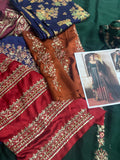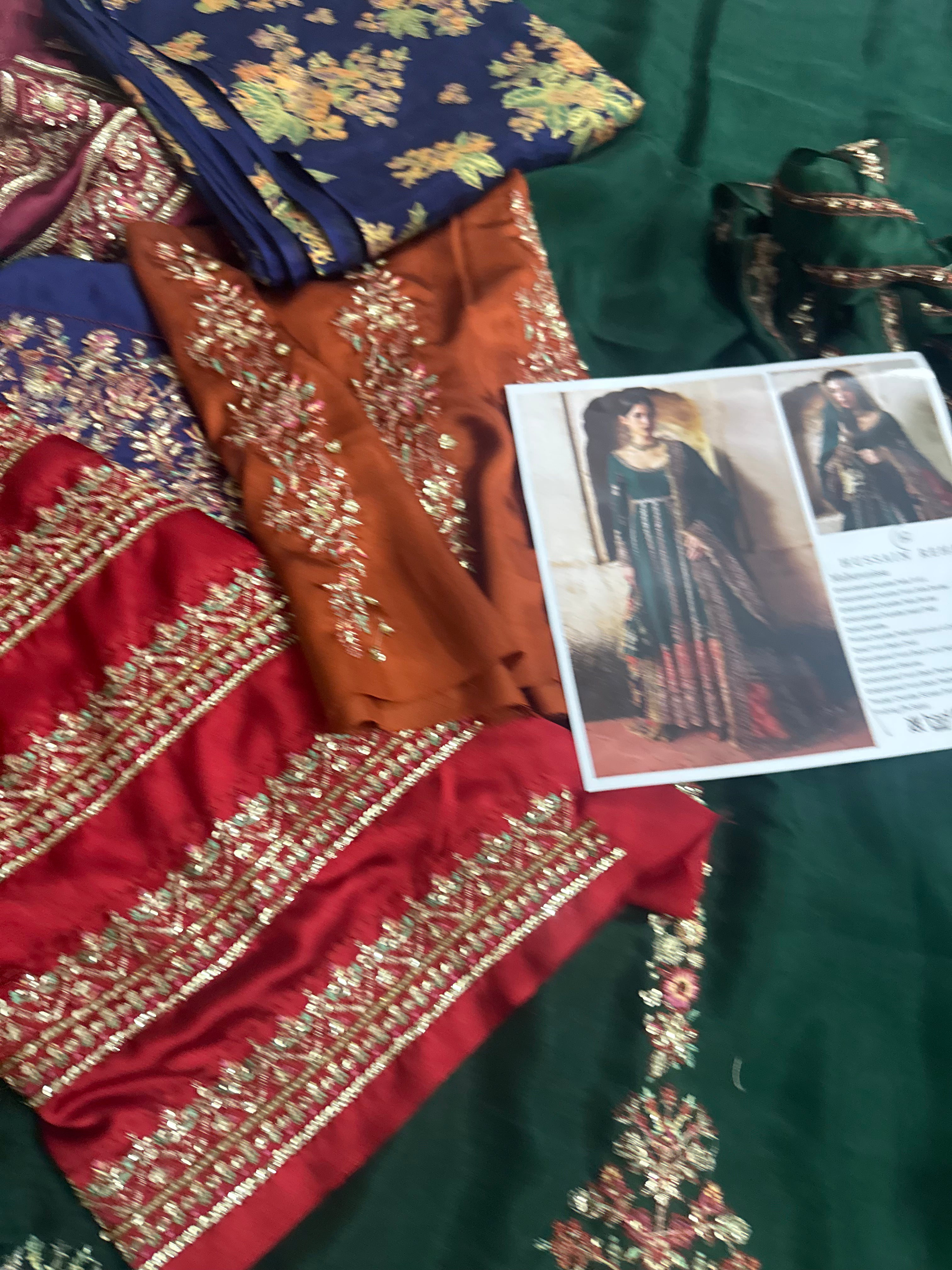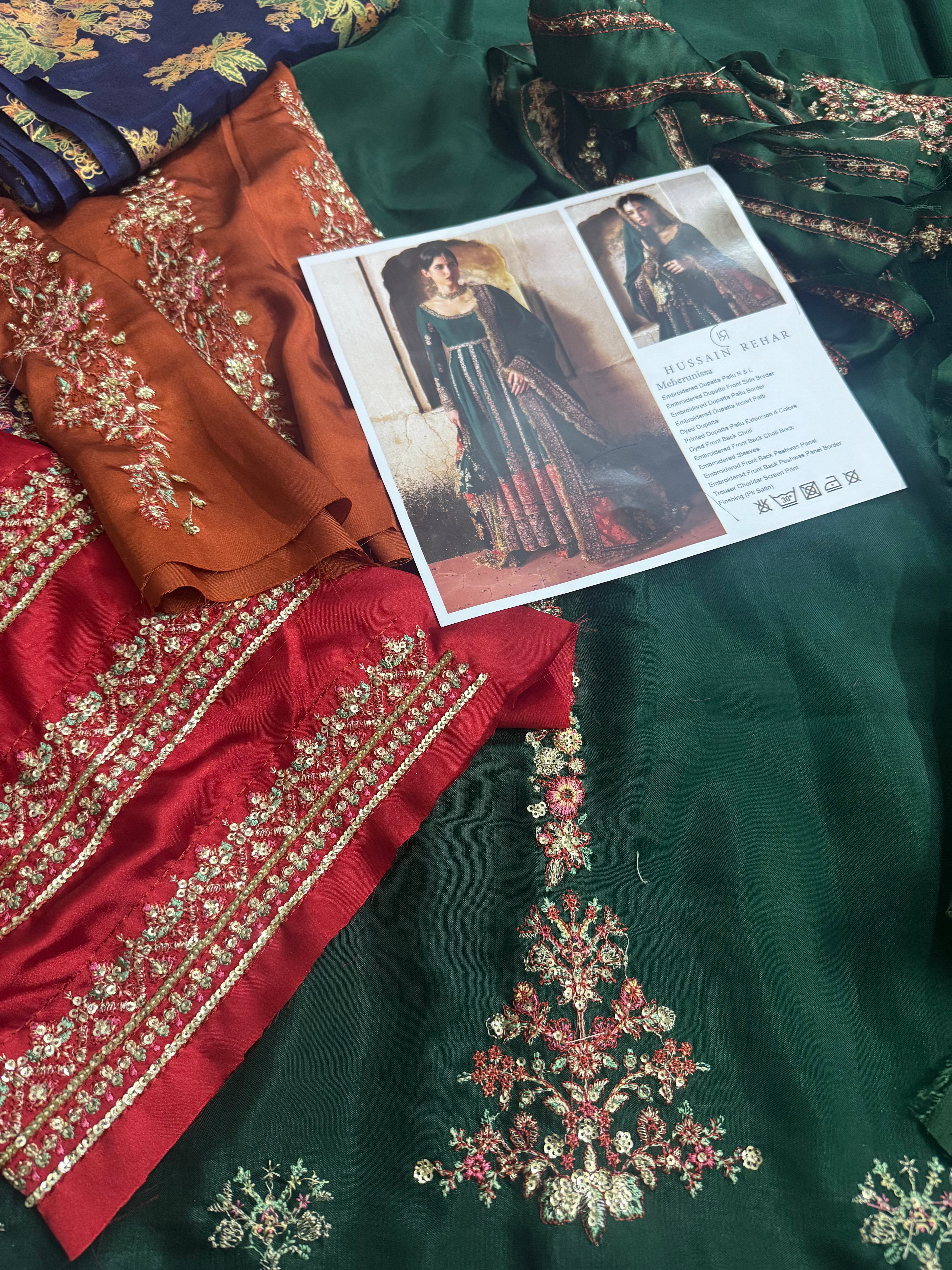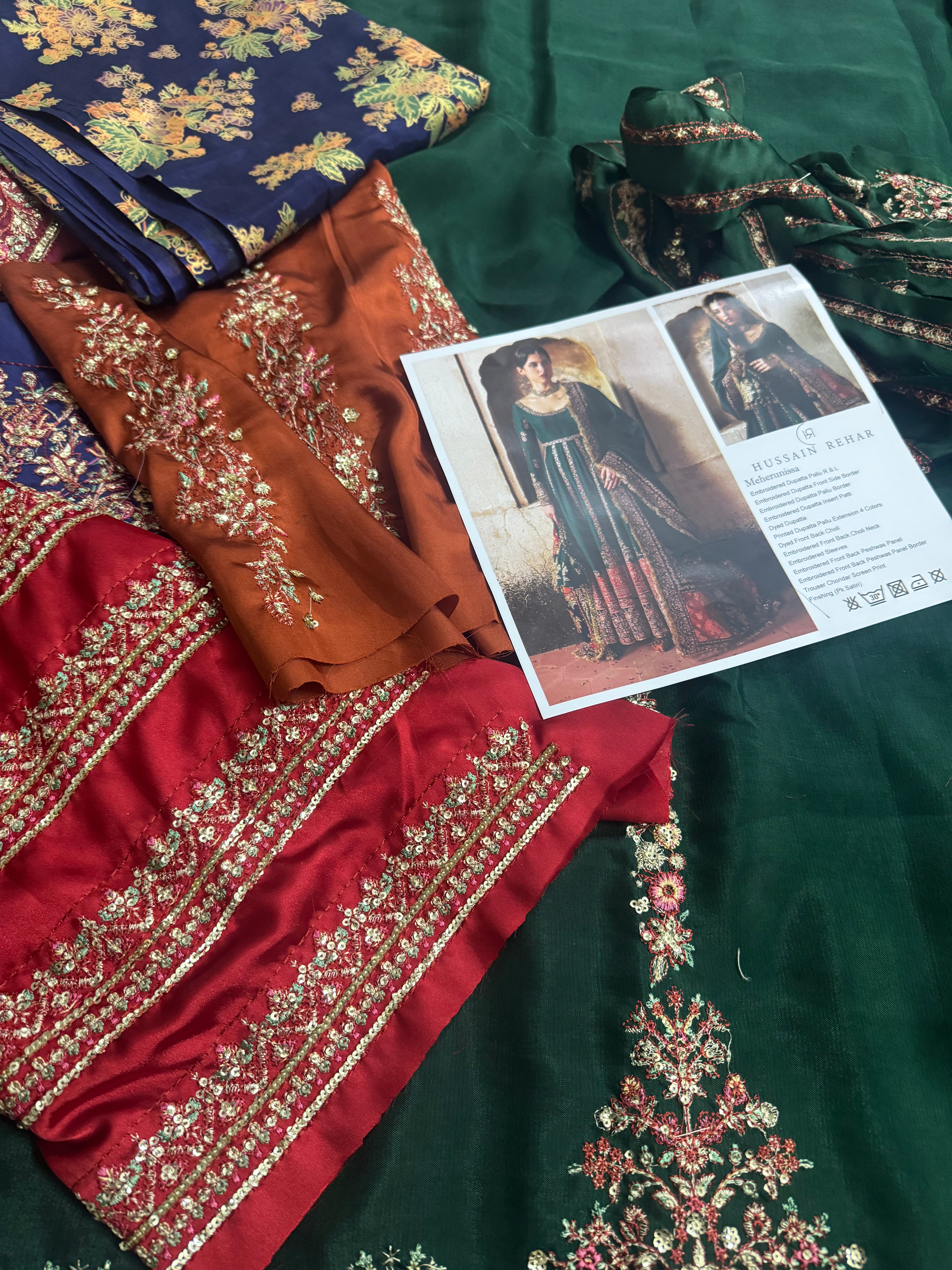 Experience timeless elegance with the magnificent Hussain Rehar Wedding Edition in a rich, captivating green and red palette. This luxurious chiffon bridal ensemble features a deep emerald or pine green long shirt/pishwas, beautifully contrasted by a vibrant red lower portion and shawl/dupatta, all adorned with intricate gold and multi-colored embroidery...