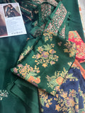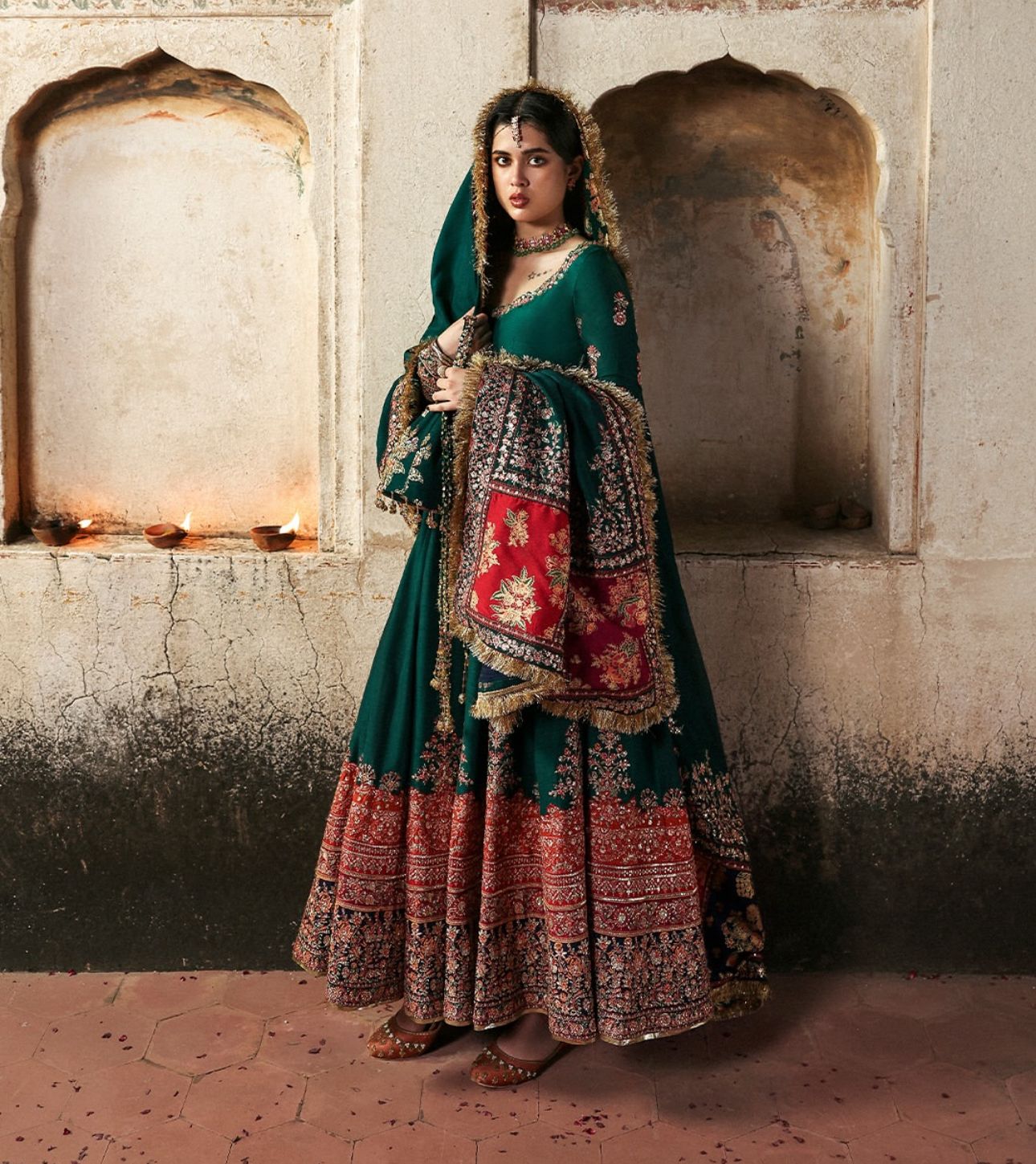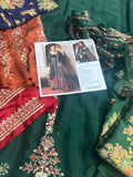 Experience timeless elegance with the magnificent Hussain Rehar Wedding Edition in a rich, captivating green and red palette. This luxurious chiffon bridal ensemble features a deep emerald or pine green long shirt/pishwas, beautifully contrasted by a vibrant red lower portion and shawl/dupatta, all adorned with intricate gold and multi-colored embroidery and embellishments, characteristic of the Hussain Rehar brand's signature craftsmanship. Perfect for a show-stopping bridal look or grand formal event, this designer outfit embodies traditional Pakistani attire with a modern, sophisticated flair. Secure this exquisite Hussain Rehar green dress for 19,500.