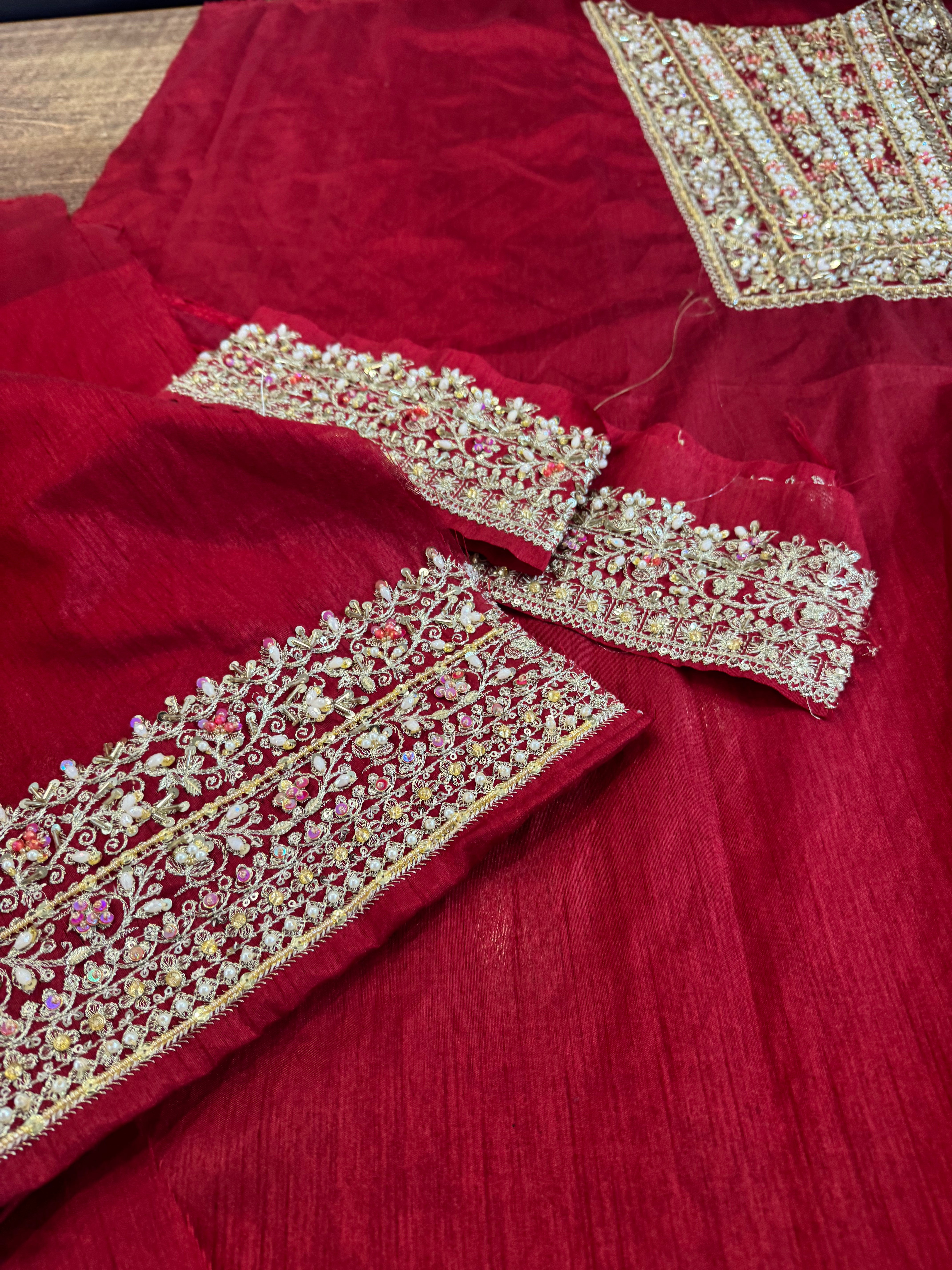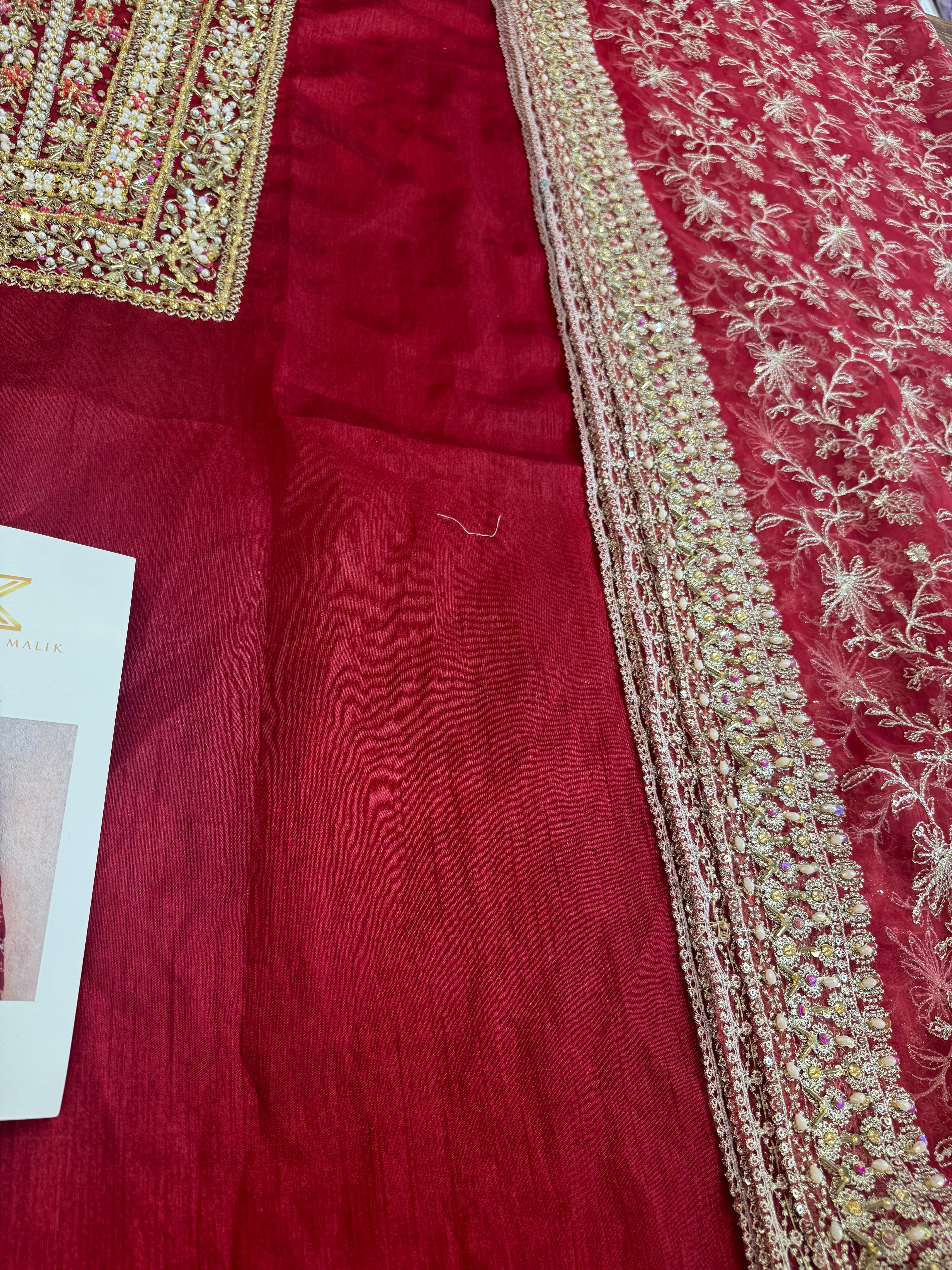 This exquisite garment from the Kanwal Malik Wedding Edition, categorized as a chiffon bridal ensemble, features a stunning rich crimson color, denoted by the inventory name "KM Red." The outfit, priced at \text{Rs.16,500} (or a comparable price point based on similar listings), is a beautifully detailed three-piece set that typically includes a sleeveless short shirt and flared trousers adorned with intricate hand embellishments and delicate gold embroidery, paired with a heavily embroidered dupatta and often a matching pouch, reflecting the brand's mastery of opulent South Asian formal wear perfect for weddings and festive occasions.