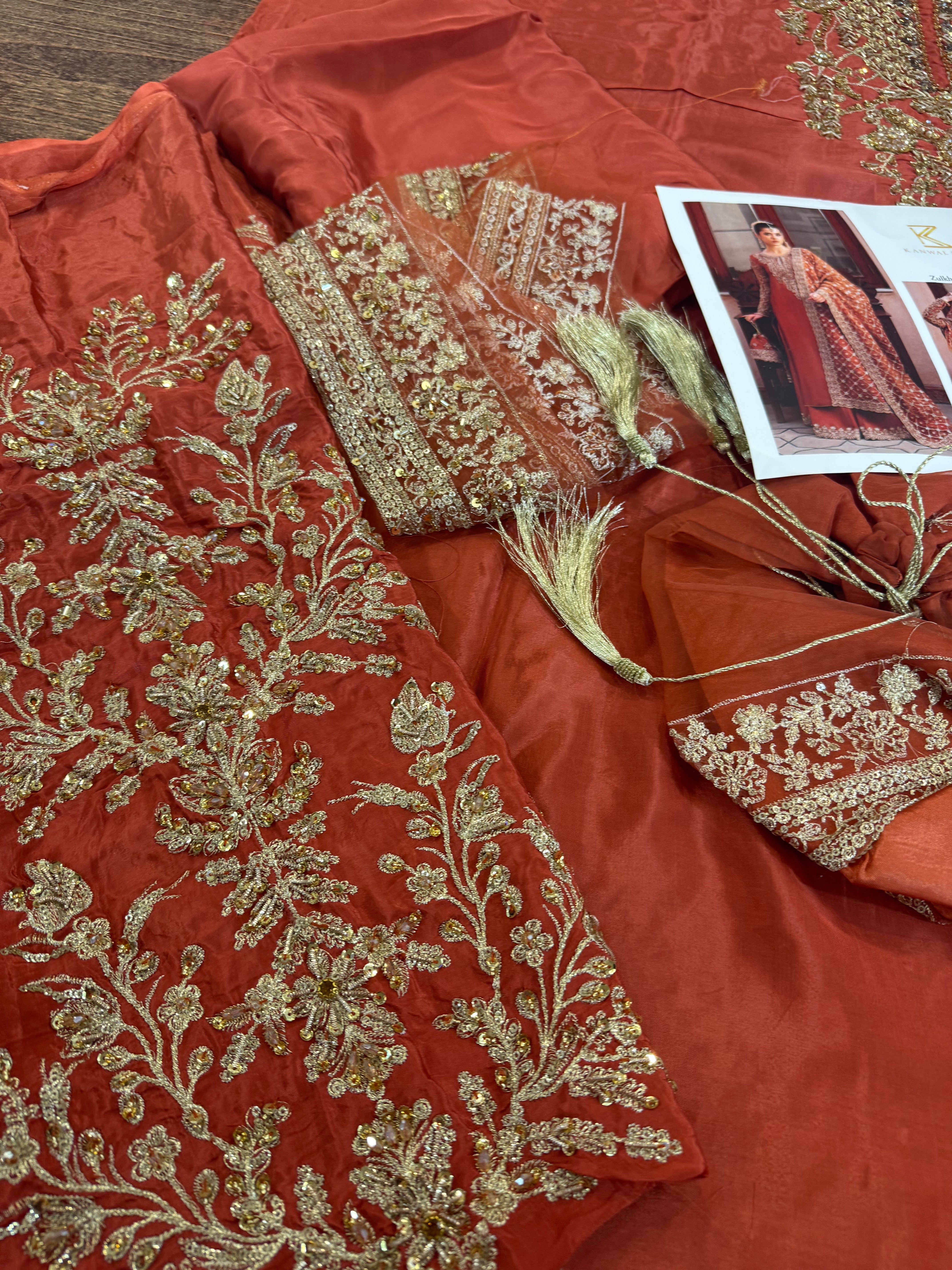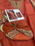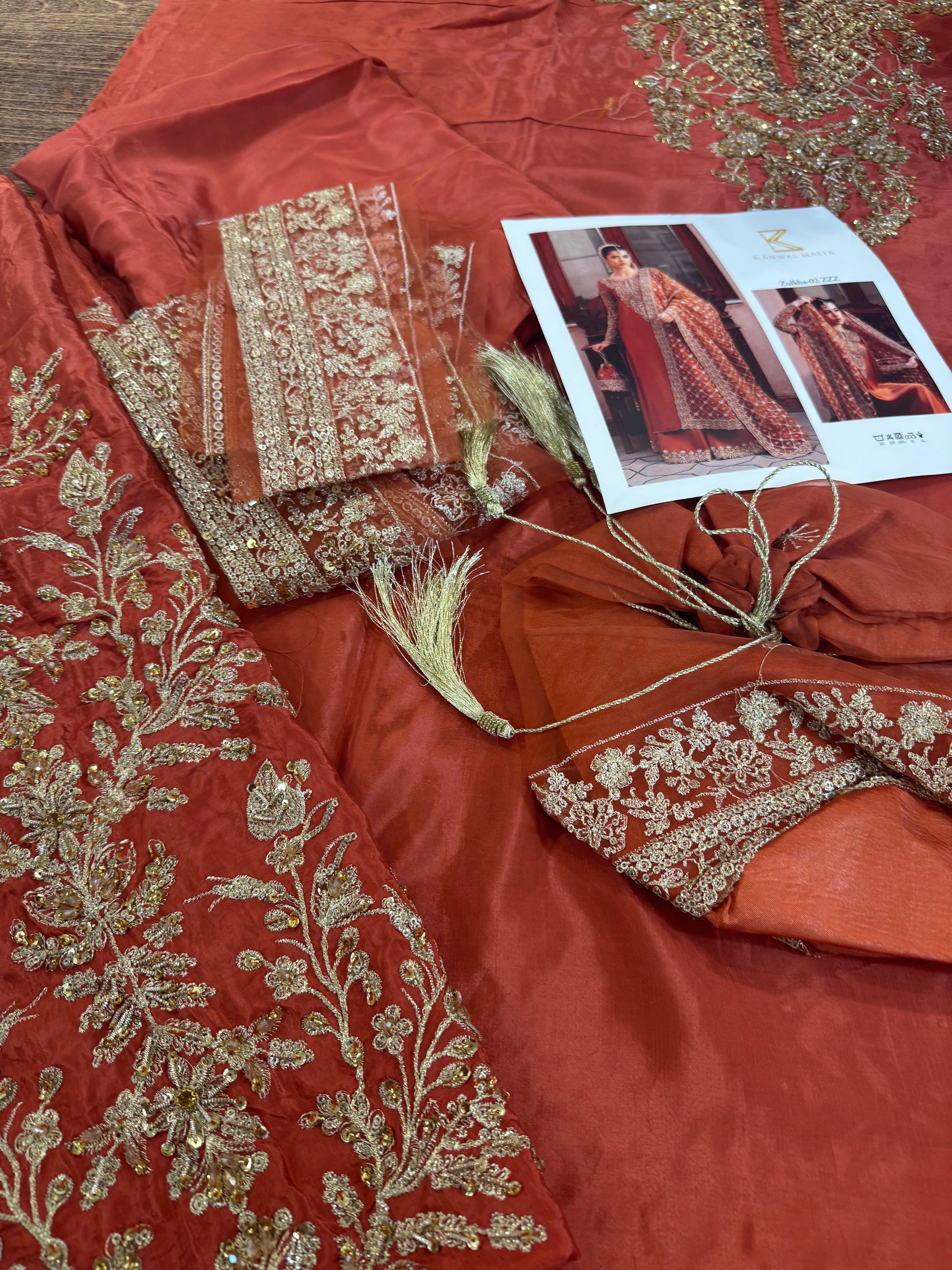 Unveil timeless elegance with the Kanwal Malik Wedding Edition in the stunning KM Rust shade, available for approximately Rs. 17,000. This exquisite ensemble from the Kanwal Malik brand features a richly embroidered long shirt, coordinating trousers, and a heavily adorned dupatta, all in a beautiful rust color. While some versions of the KM Rust outfit are noted as being crafted in luxury raw silk with intricate hand embellishment, this style is representative of the designer's formal wedding wear collections, which also include luxurious materials like chiffon, suitable for a bridal or formal occasion. The look is complete with a matching embellished potli bag (as seen in the image), making it a perfect, regal statement for weddings.