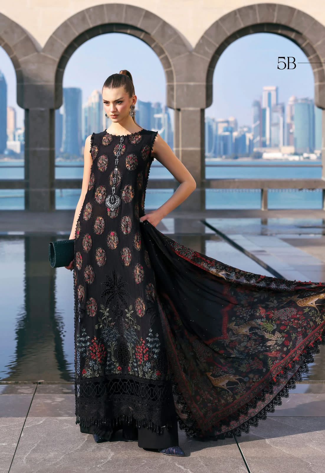 Elevate your summer wardrobe with the Maria B Lawn 2026 Collection, featuring the stunning Design 5B in a timeless, sophisticated black. This exquisite three-piece ensemble is a masterclass in elegance, showcasing a high-quality lawn shirt adorned with intricate digital prints and delicate embroidered motifs that flow into a heavy cutwork border. The outfit is perfectly paired with a diaphanous, printed dupatta and solid-colored trousers, offering a seamless blend of traditional craftsmanship and modern silhouette. Whether you're attending a festive Eid gathering or a formal evening event, this Maria B Black masterpiece ensures a luxurious feel and a head-turning look. Now available for 8750, it’s an essential addition for those who value the premium artistry of the Lawn Maria B category.
