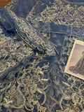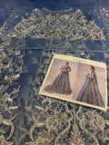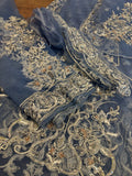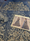 Make a grand entrance on your special day with this breathtaking bridal lehenga from the Nayra Wedding Collection. The stunning blue chiffon ensemble is a true masterpiece, featuring an intricate display of silver and gray embroidery. The long-sleeved choli is heavily embellished, complemented by a gorgeous full skirt with a...