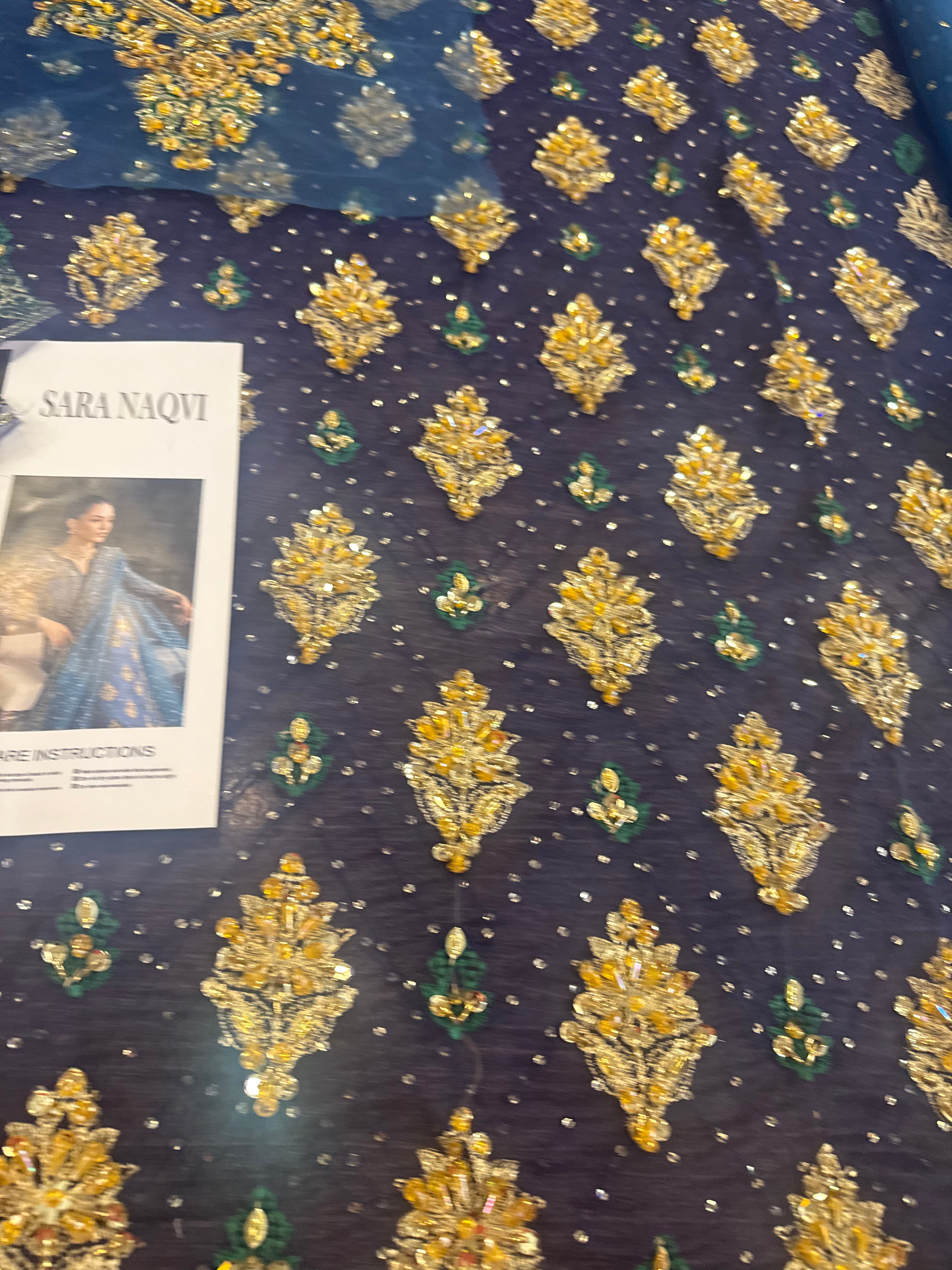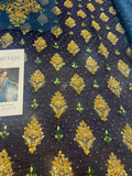 This exquisite Sara Naqvi chiffon bridal suit, part of the Wedding Edition collection, showcases a rich blue color lavishly adorned with intricate gold embroidery and embellishments, characteristic of a luxury formal piece from the brand. The ensemble features a long-sleeved kameez (shirt) and is paired with a matching teal-blue dupatta (scarf) that is also heavily bordered and embellished, adding to its grand and festive appeal, perfect for bridal or wedding formal occasions, and is listed at a price of 21000.