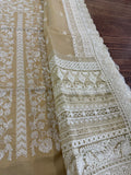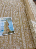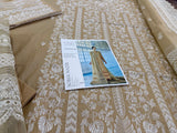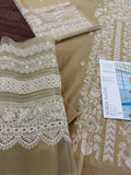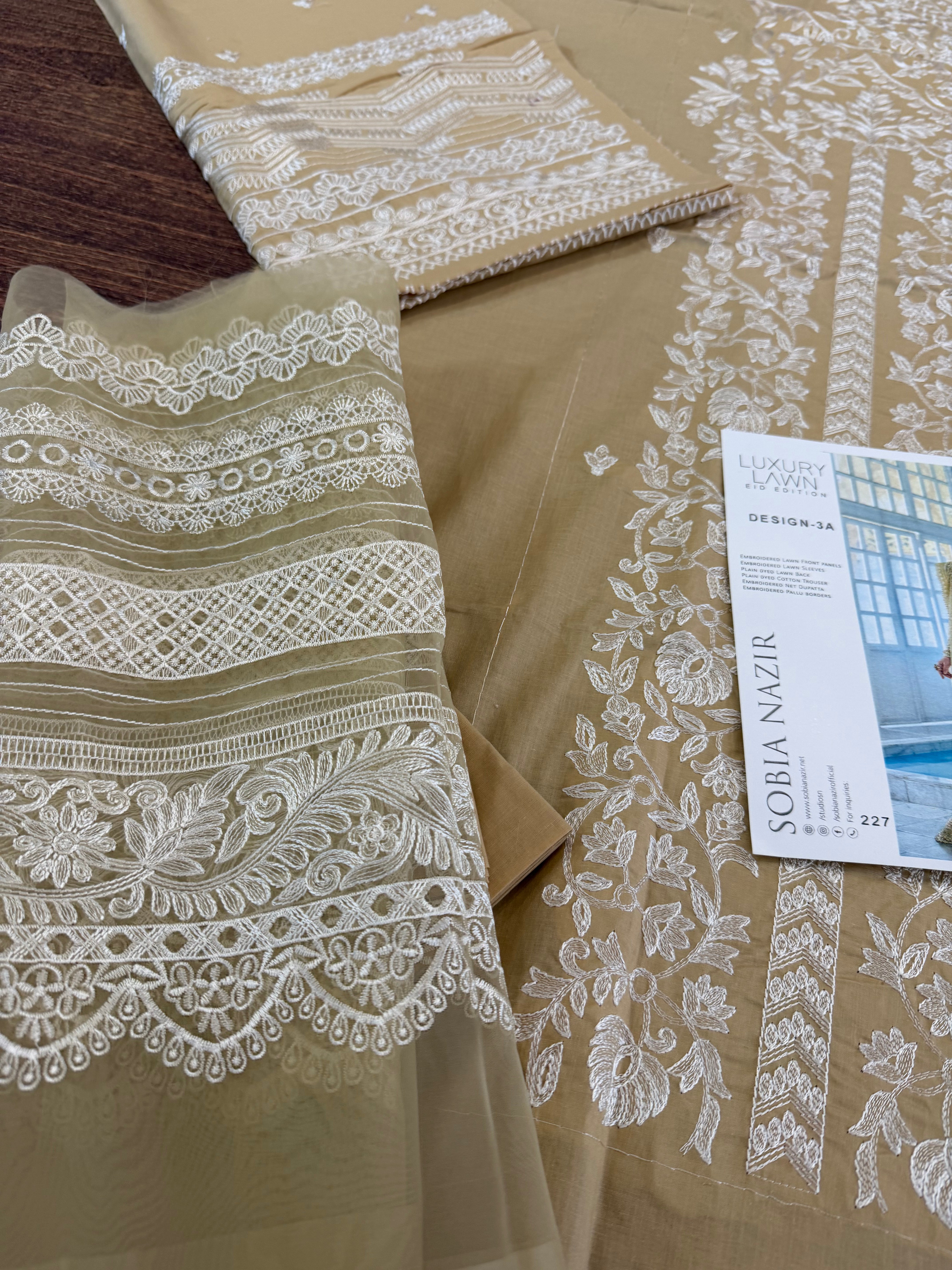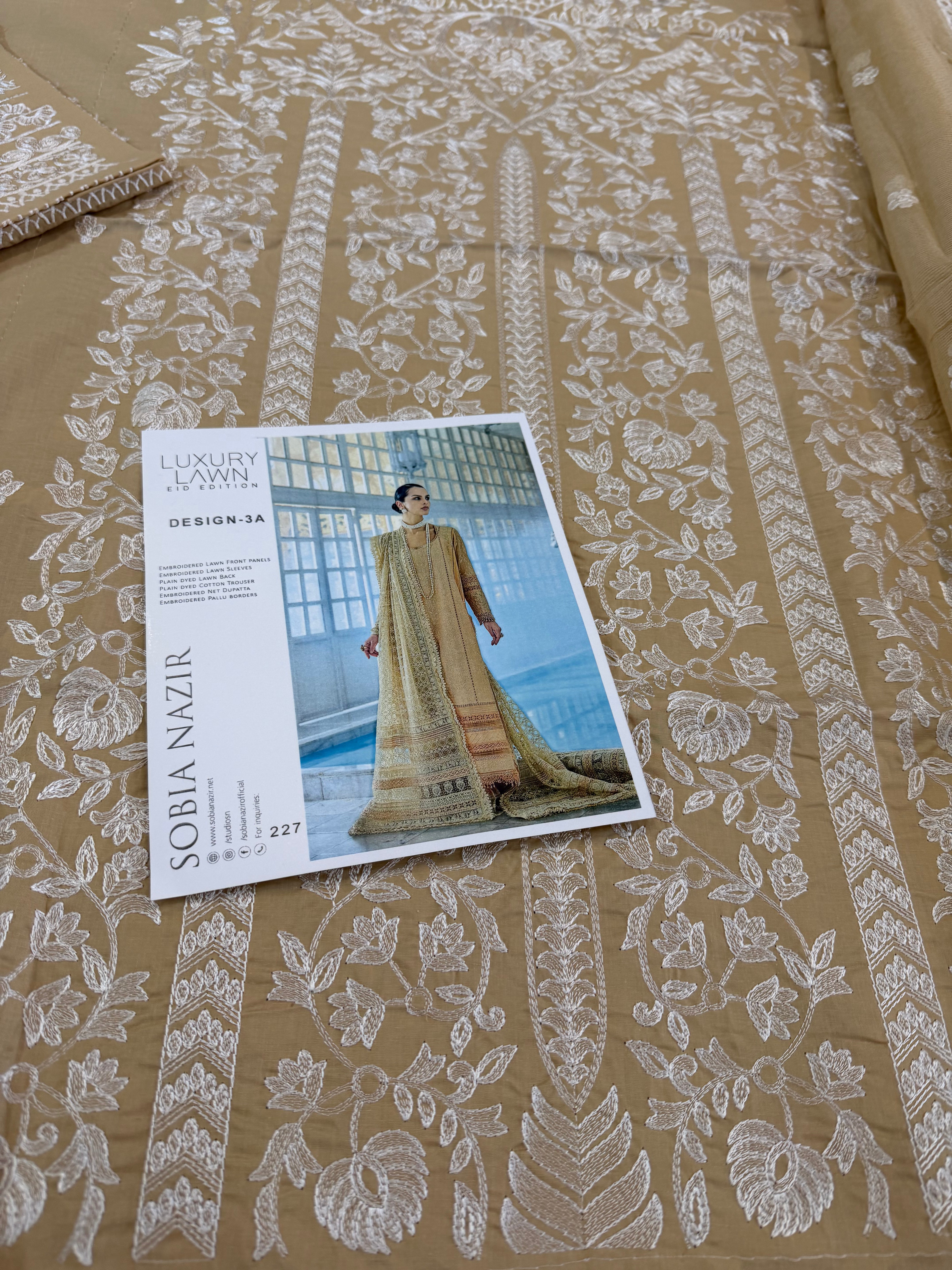 Embrace the height of summer elegance with the Sobia Nazir Lawn 2026 collection, featuring this stunning skin golden ensemble that perfectly balances traditional artistry with modern sophistication. This 3-piece unstitched luxury lawn suit is designed for breathability and style, making it an essential staple for festive occasions or elevated daily wear. The outfit boasts a meticulously embroidered lawn front, complemented by detailed sleeves and a sequence of intricate daman and neck patches that showcase the brand's signature craftsmanship. Paired with a delicately finished dupatta and a premium plain dyed trouser, this ensemble offers a complete, high-end look at an accessible price of Rs. 9,500. Whether you're attending a garden party or a summer celebration, this Sobia Nazir masterpiece ensures you stay cool while radiating effortless chic.