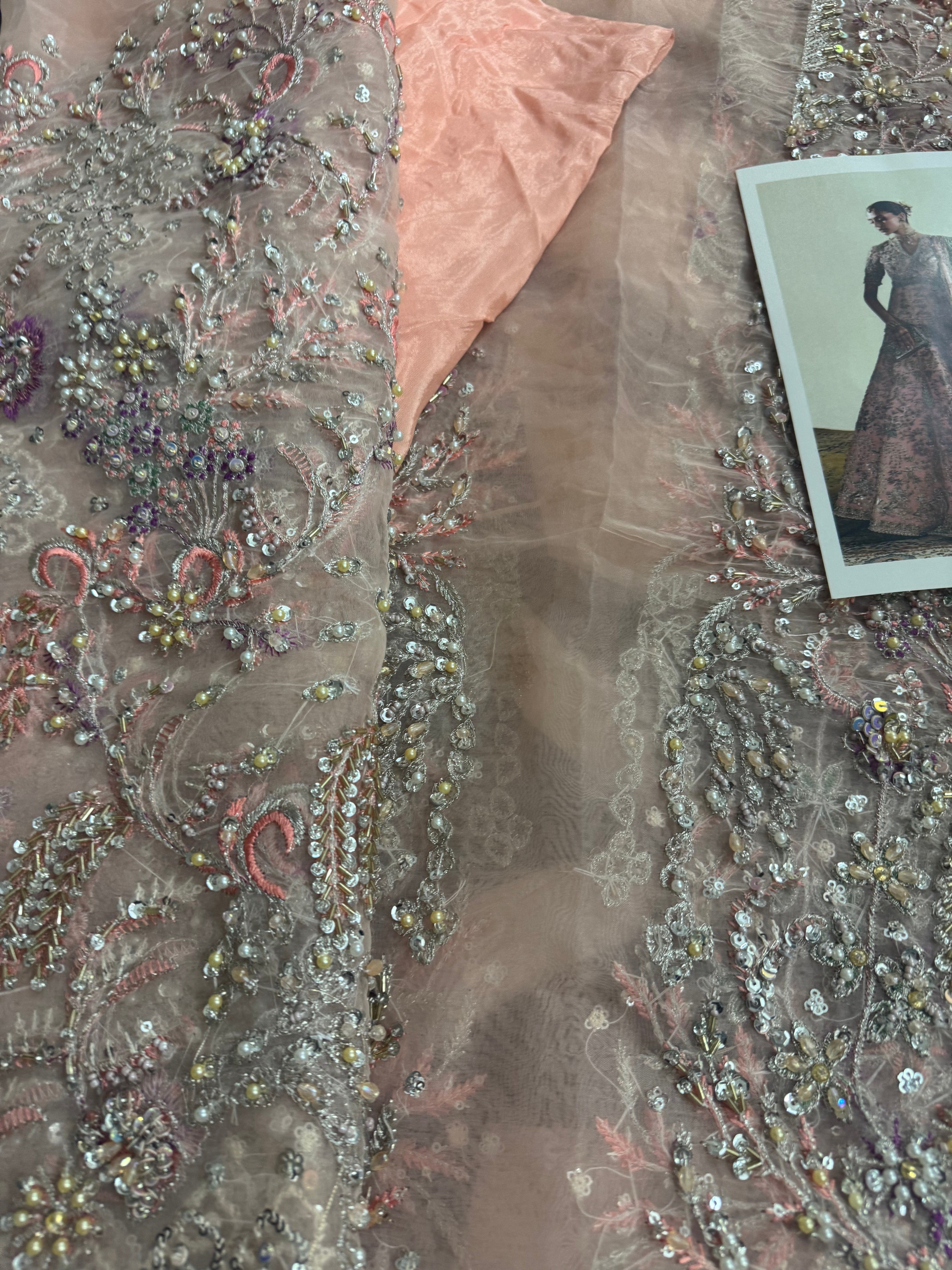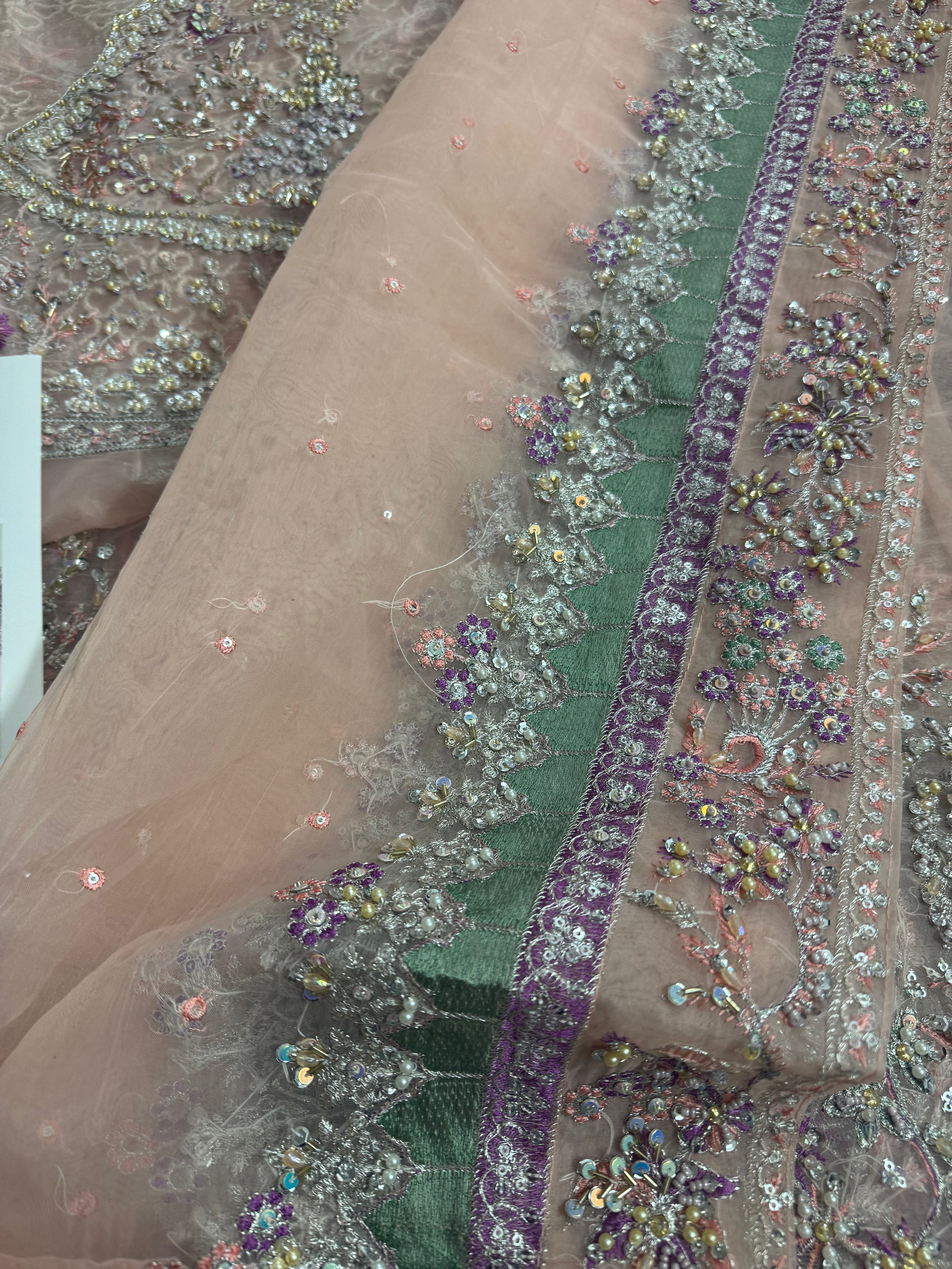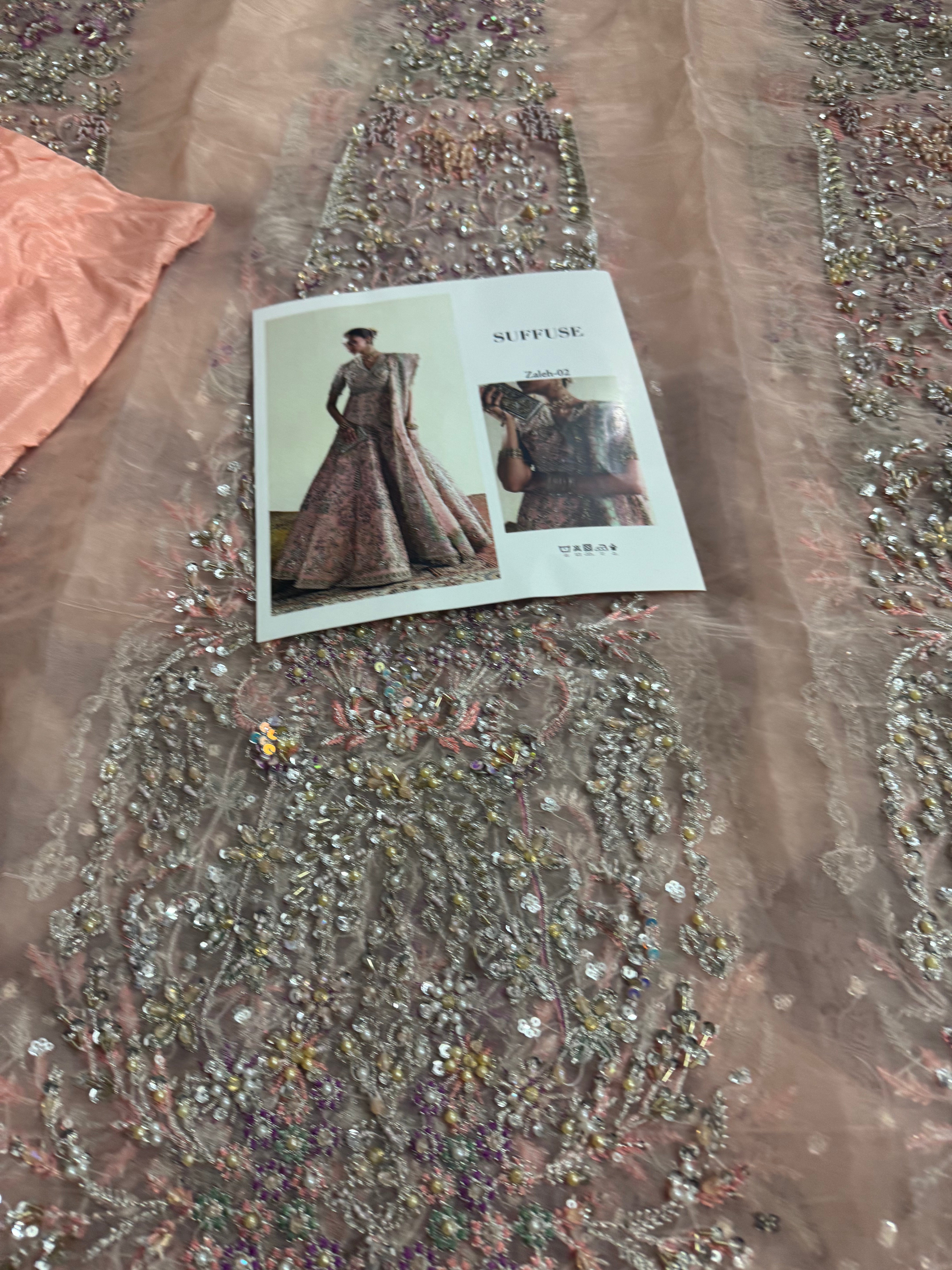 This exquisite piece from the Suffuse Wedding Edition by the brand Suffuse by Sana Yasir is a stunning chiffon bridal outfit in a soft pink hue. The ensemble features a heavily embellished lehenga with intricate embroidery and beadwork, paired with a matching blouse and a beautifully draped dupatta. The delicate...