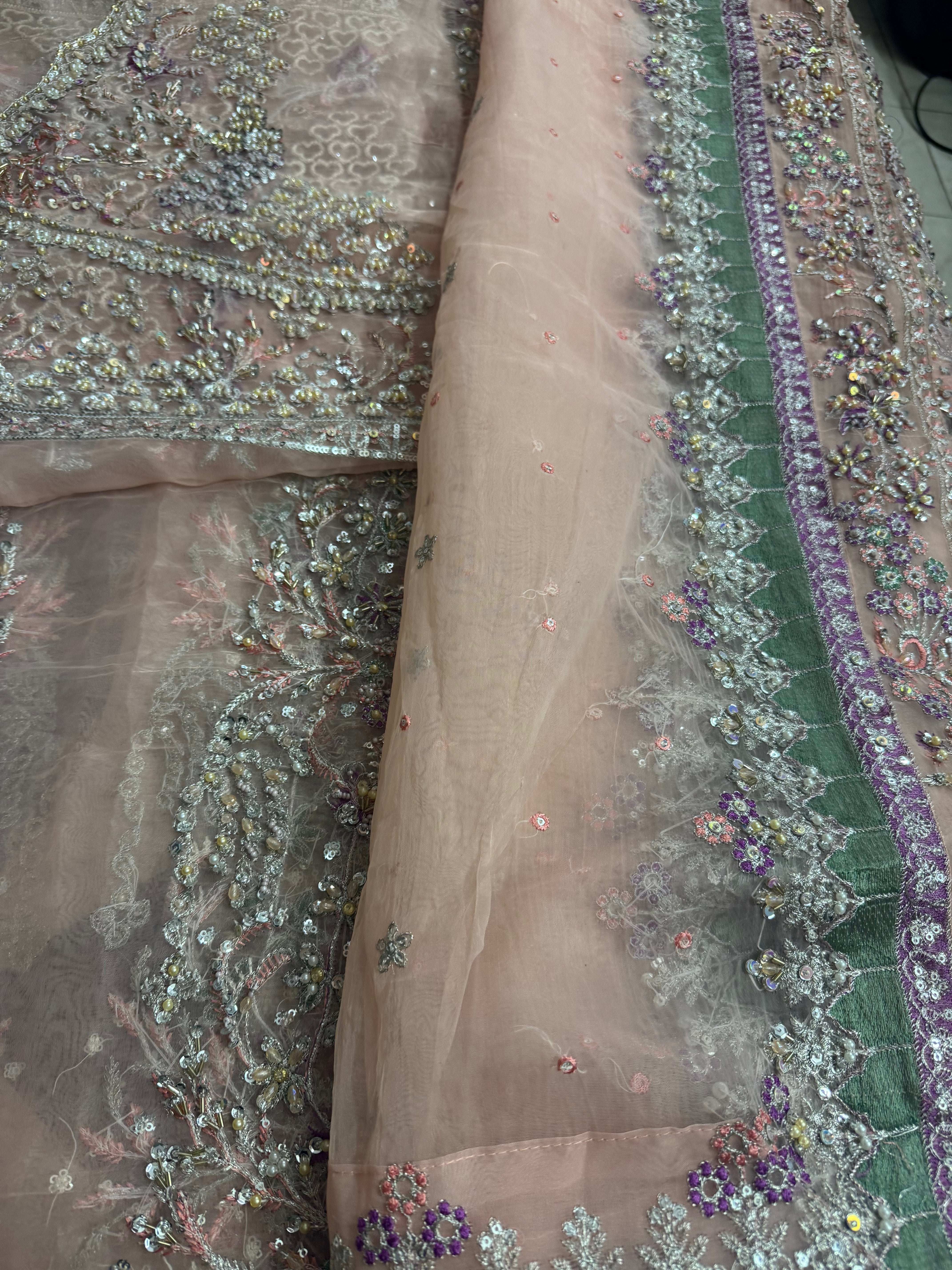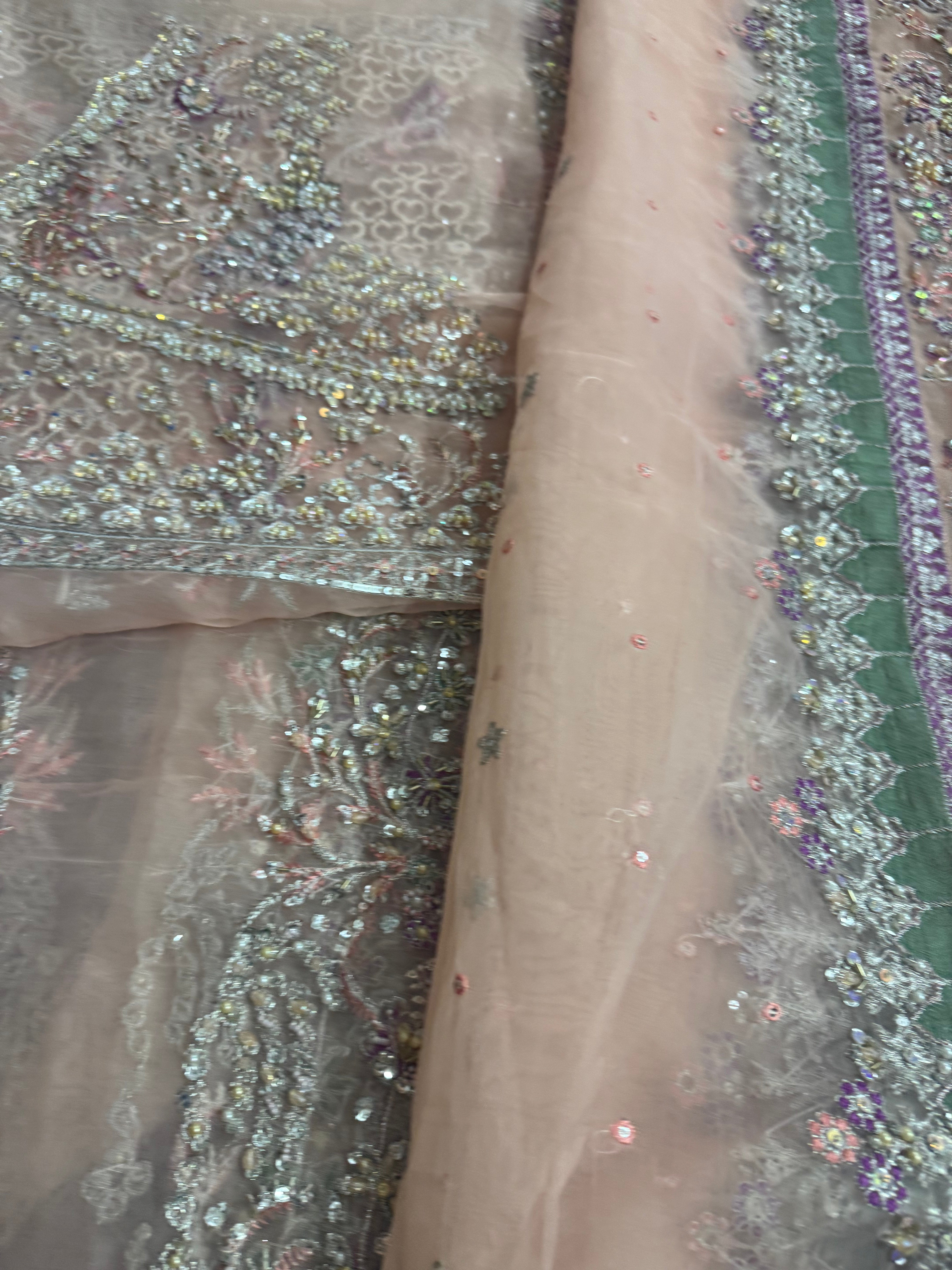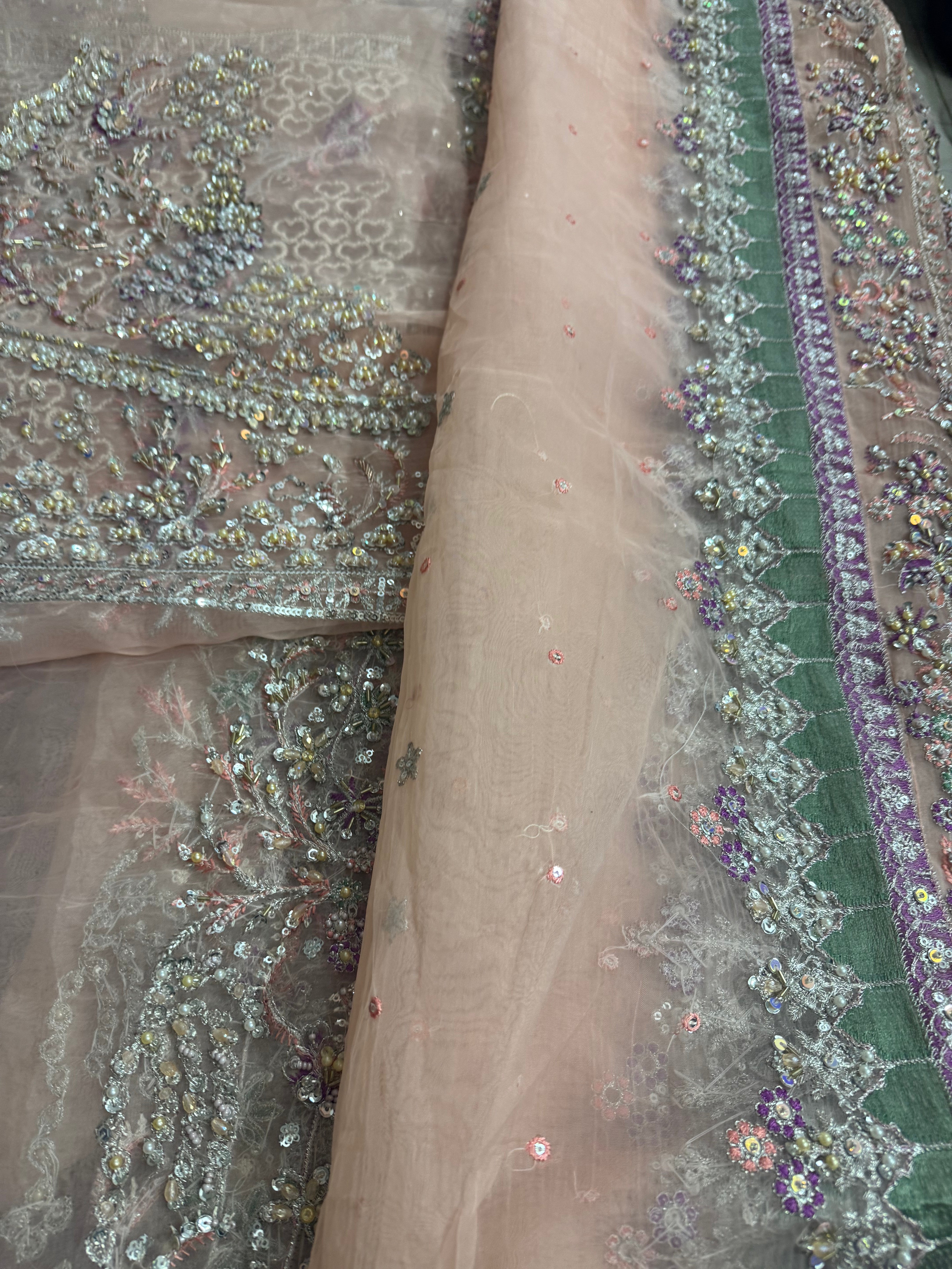 This exquisite piece from the Suffuse Wedding Edition by the brand Suffuse by Sana Yasir is a stunning chiffon bridal outfit in a soft pink hue. The ensemble features a heavily embellished lehenga with intricate embroidery and beadwork, paired with a matching blouse and a beautifully draped dupatta. The delicate...